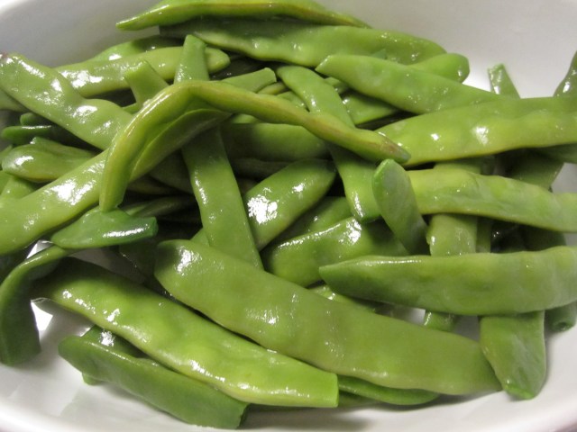 My mother is visiting again this weekend, and has brought me a variety of stringbean that I can’t seem to find at my local farm stands–the flat stringbean, or Italian pole bean. Someone has given these to her from their garden in New Jersey. These beans require a longer cooking time than a conventional stringbeans, but are meatier, denser and more flavorful as well.