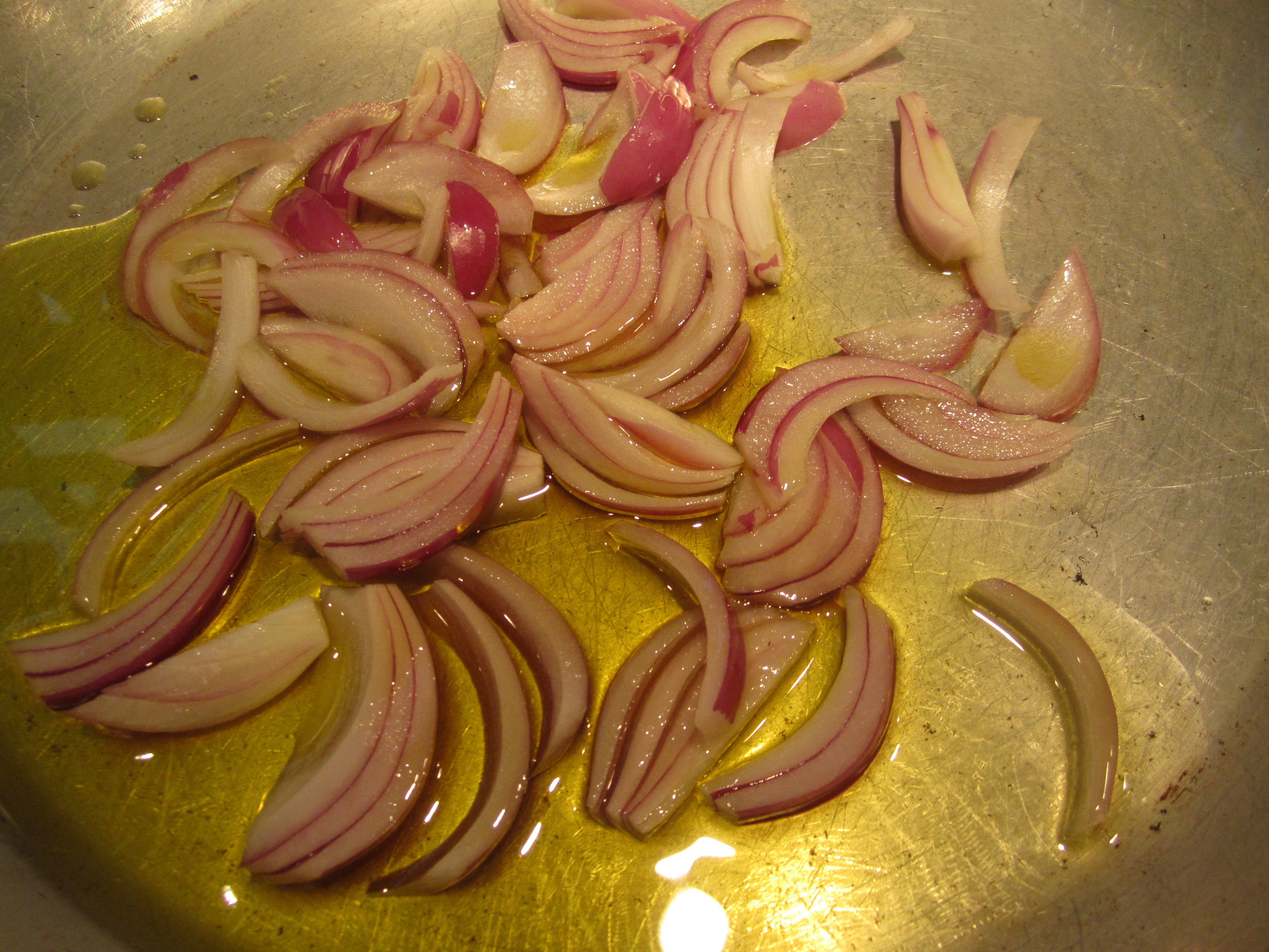 In a broad skillet, heat oil and onions. Saute onions for about 2 minutes on high heat.