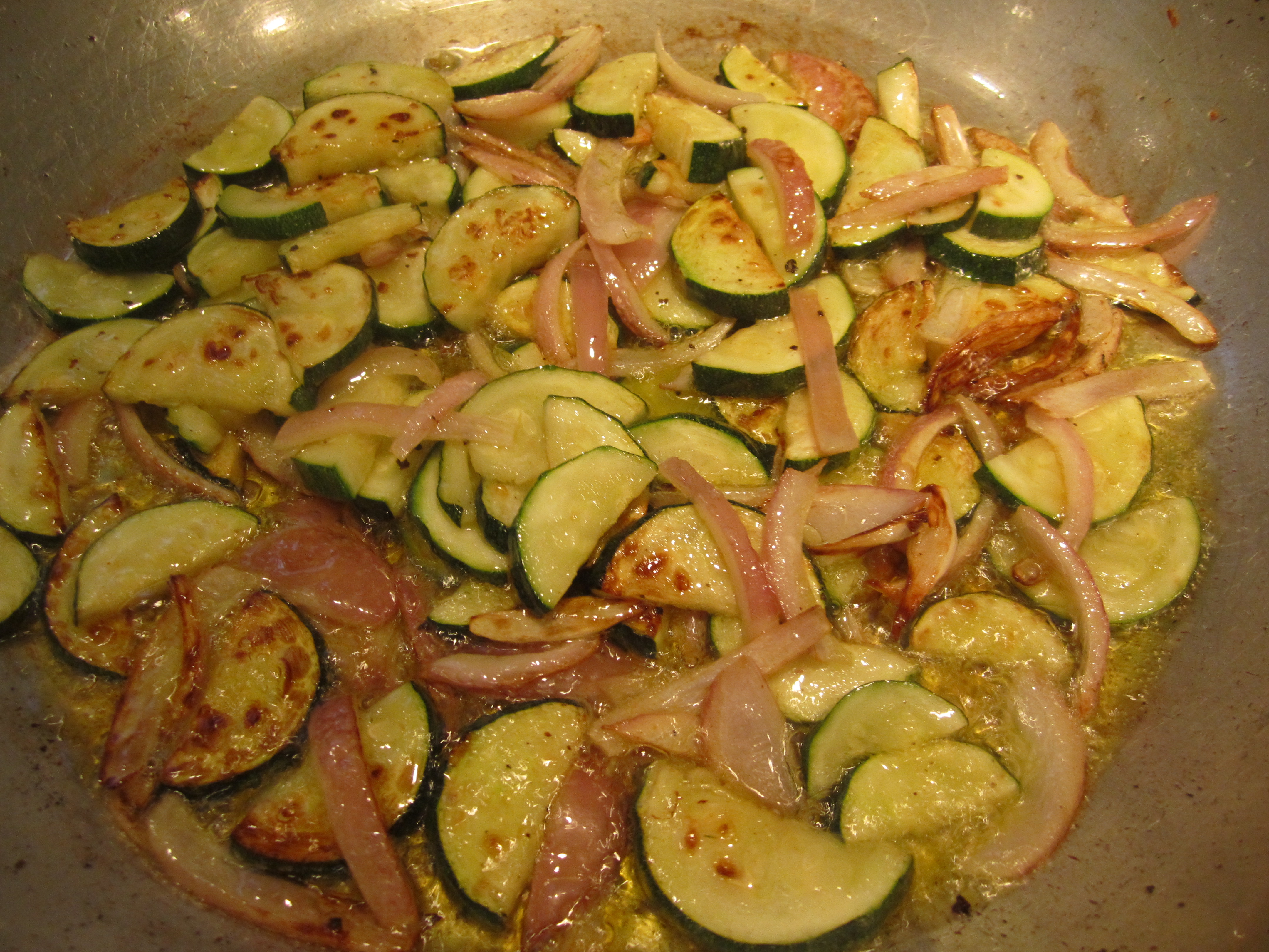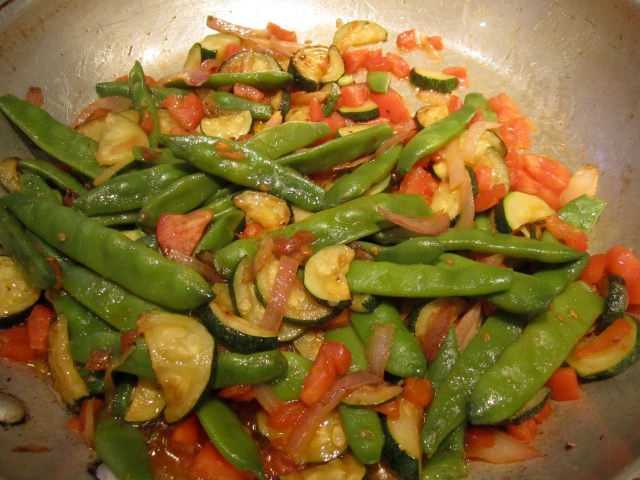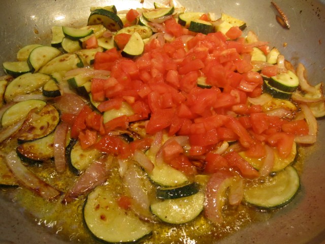My mother usually dresses them with olive oil and red wine vinegar, but tonight, we’re sauteing them with zucchini and chopped fresh tomato. A little bacon wouldn’t hurt, but tonight, I’m keeping the flavors clean and uncluttered.