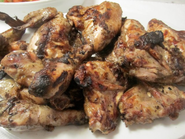 They are first seared over high flames, then moved to the cool side of the grill on indirect heat to roast, covered, for about an hour. At the last minute, they’re moved back to the flame until the skin is crispy and slighty charred.