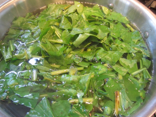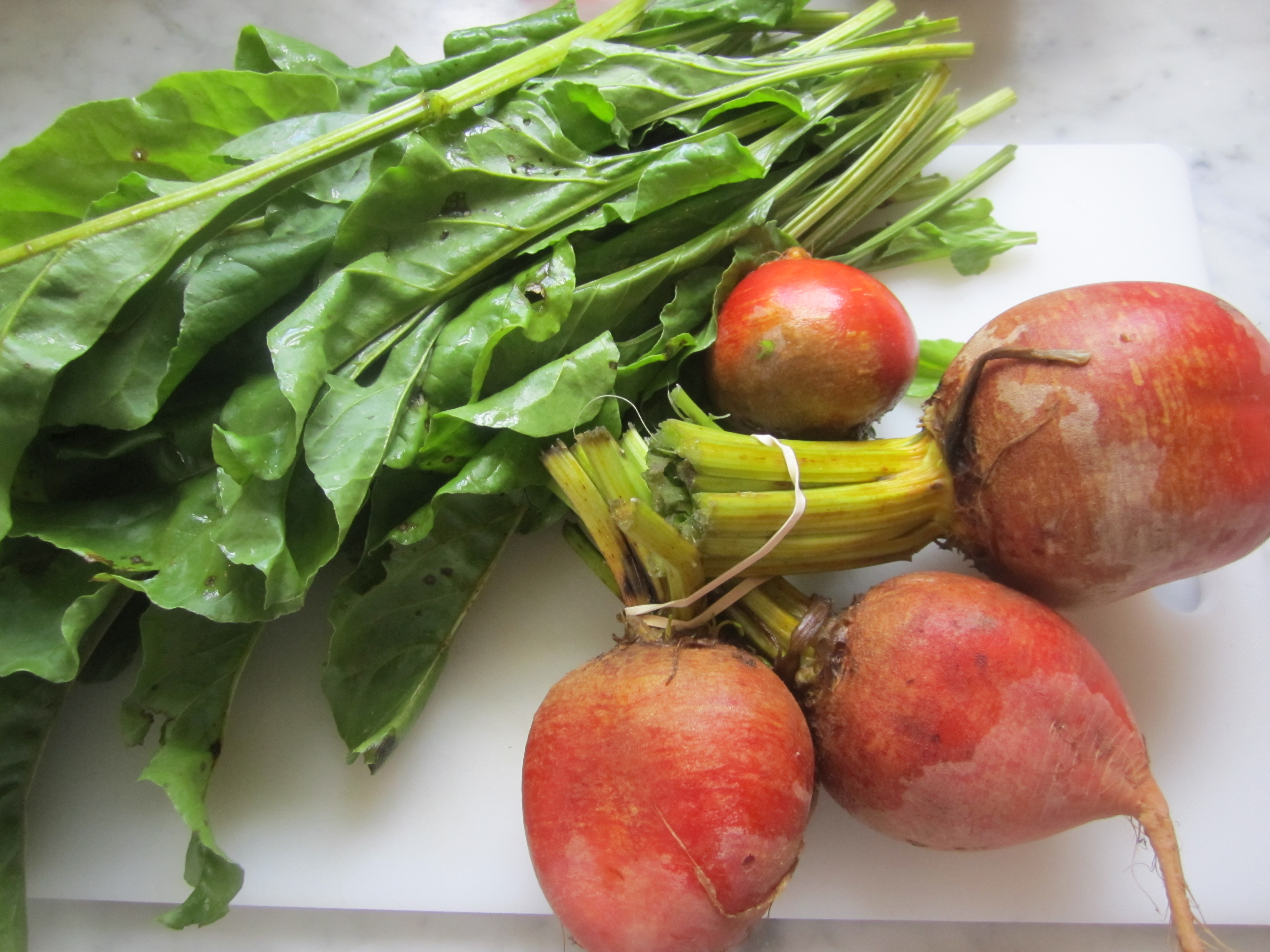 Beet greens take a little work to prepare, but are well worth the effort. Simply wash them in several changes of water, until no soil remains at the bottom of the bowl. Drop into salted boiling water. They need to boil longer than most greens because their stems are very sturdy. You want to cook them until the stems are tender. Drain, rinse with cold water, and squeeze in small bunches until no more water remains.