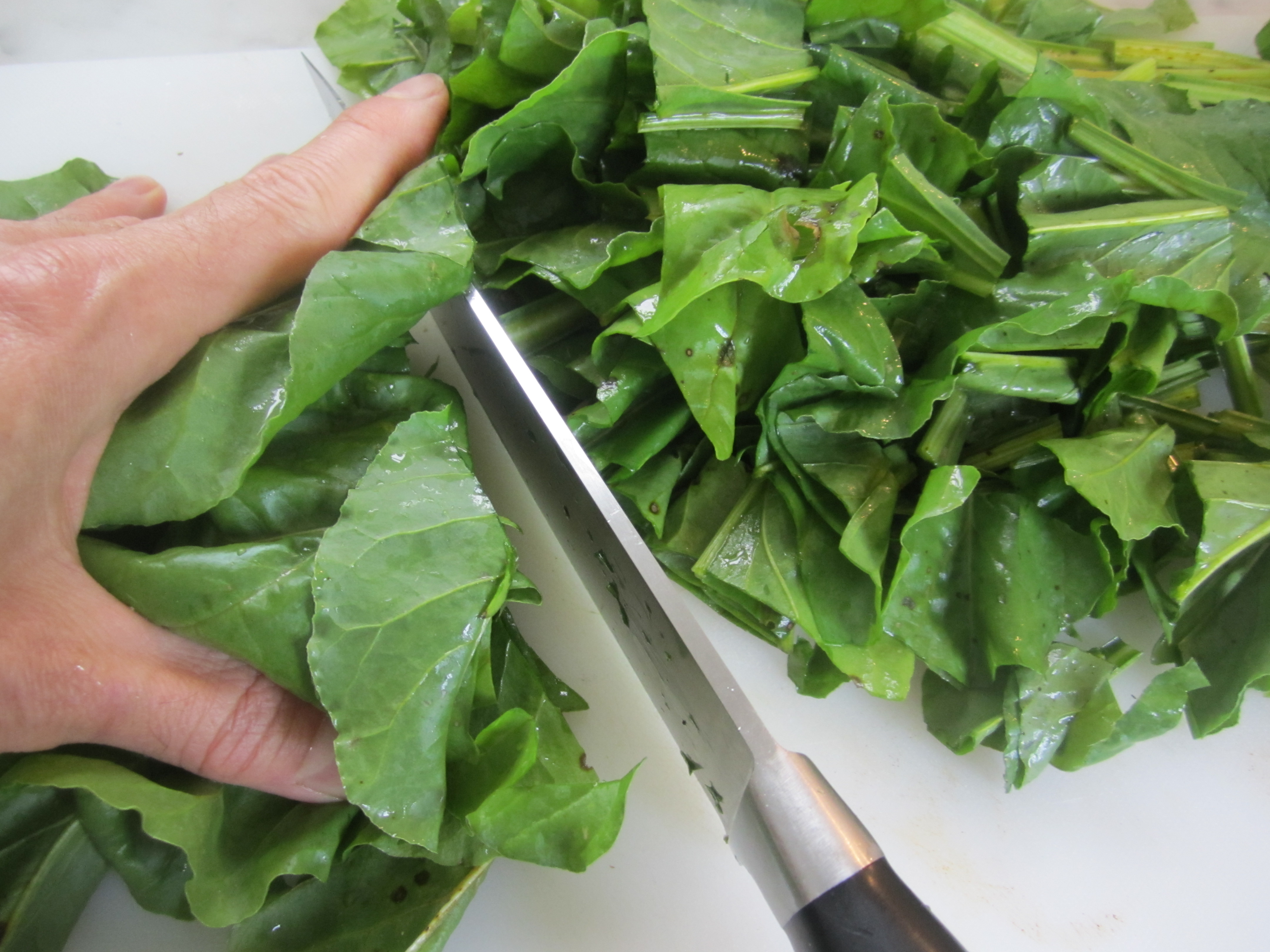 To clean the greens, chop into large segments about 1 1/2″ long.