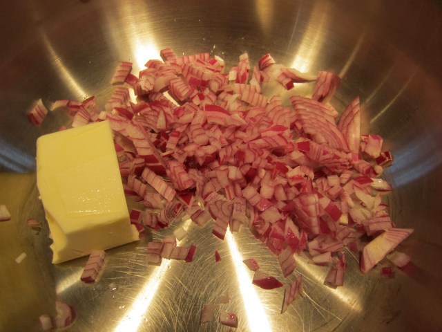In a high sided saute pan, on medium heat, bring onions and butter to a sizzle and saute for about 5 minutes or until onions turn translucent and begin to wilt.