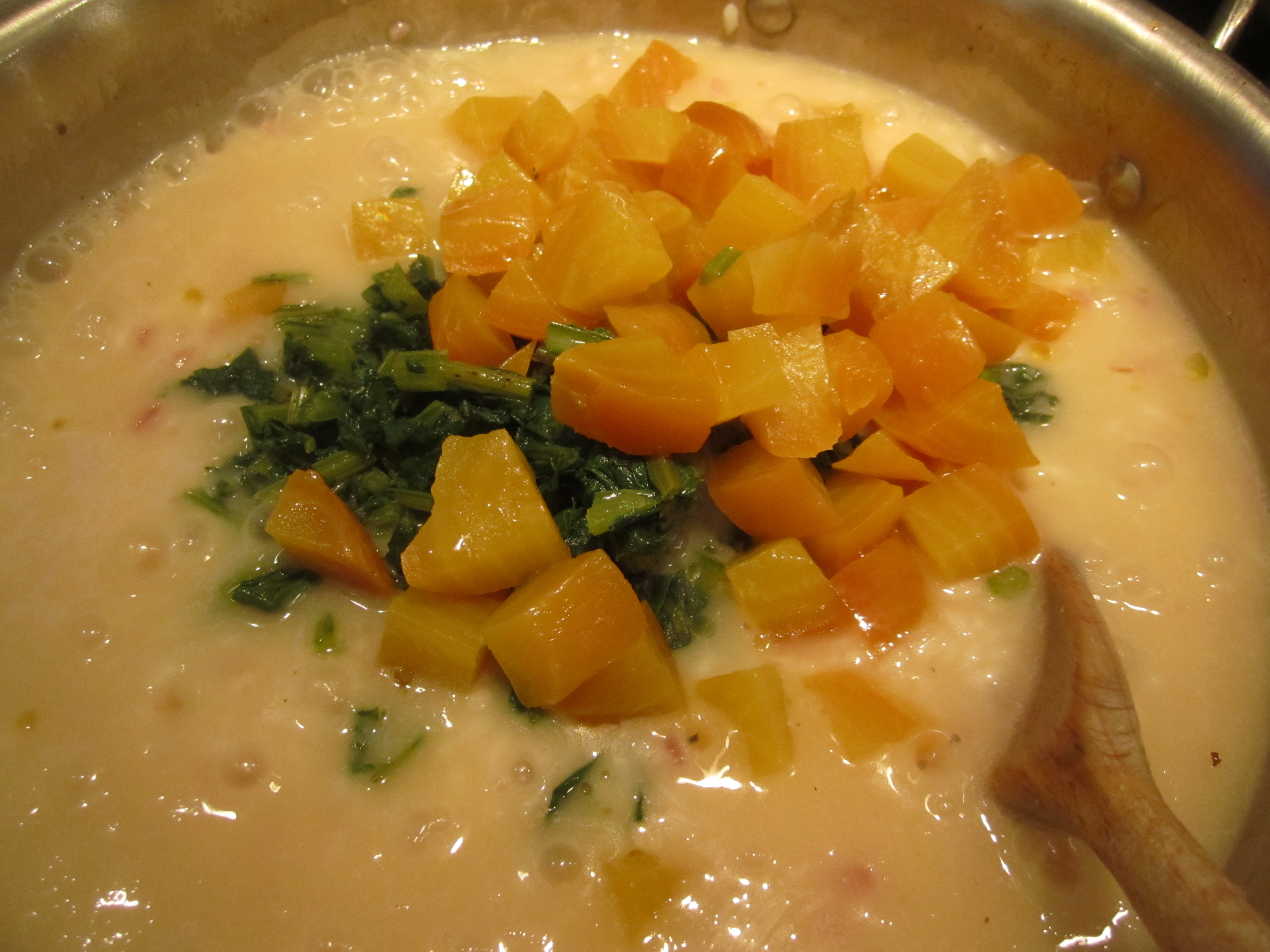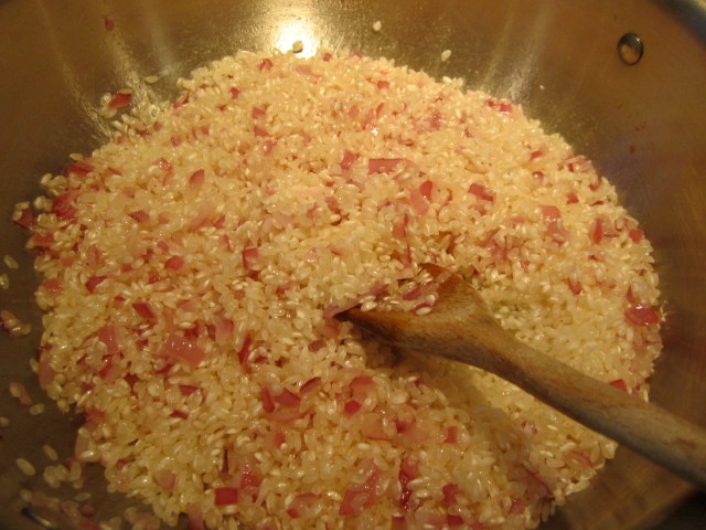 The risotto technique is the same one I’ve shown you in prior posts, but I’ll go through it here from start to finish. The beets and greens simply get folded in during the last minutes of cooking.