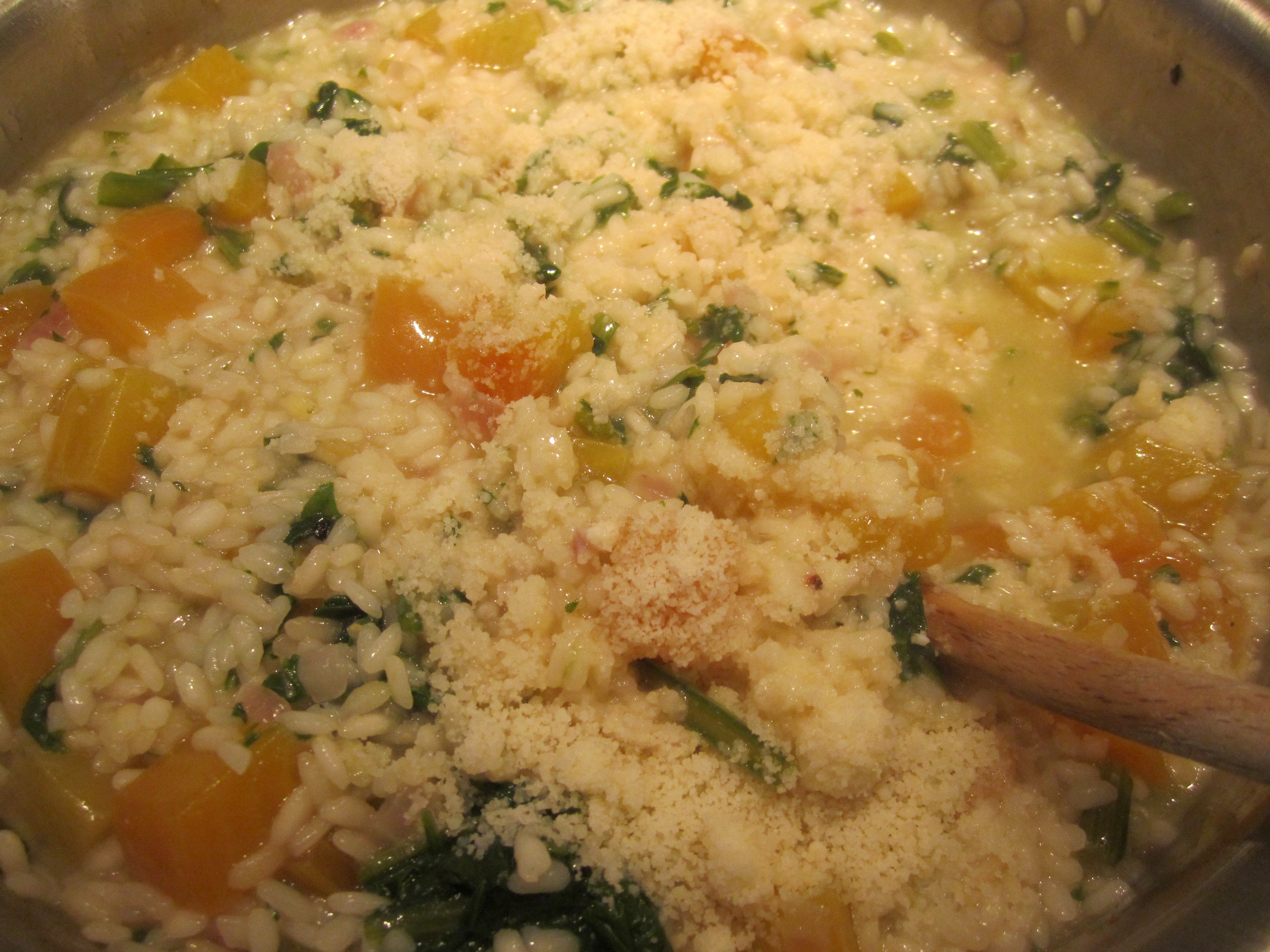 Turn off heat and cover for 5 minutes. At the end of 5 minutes, add a bit more simmering broth to loosen the mixture, as well as a good handful of the grated cheese.