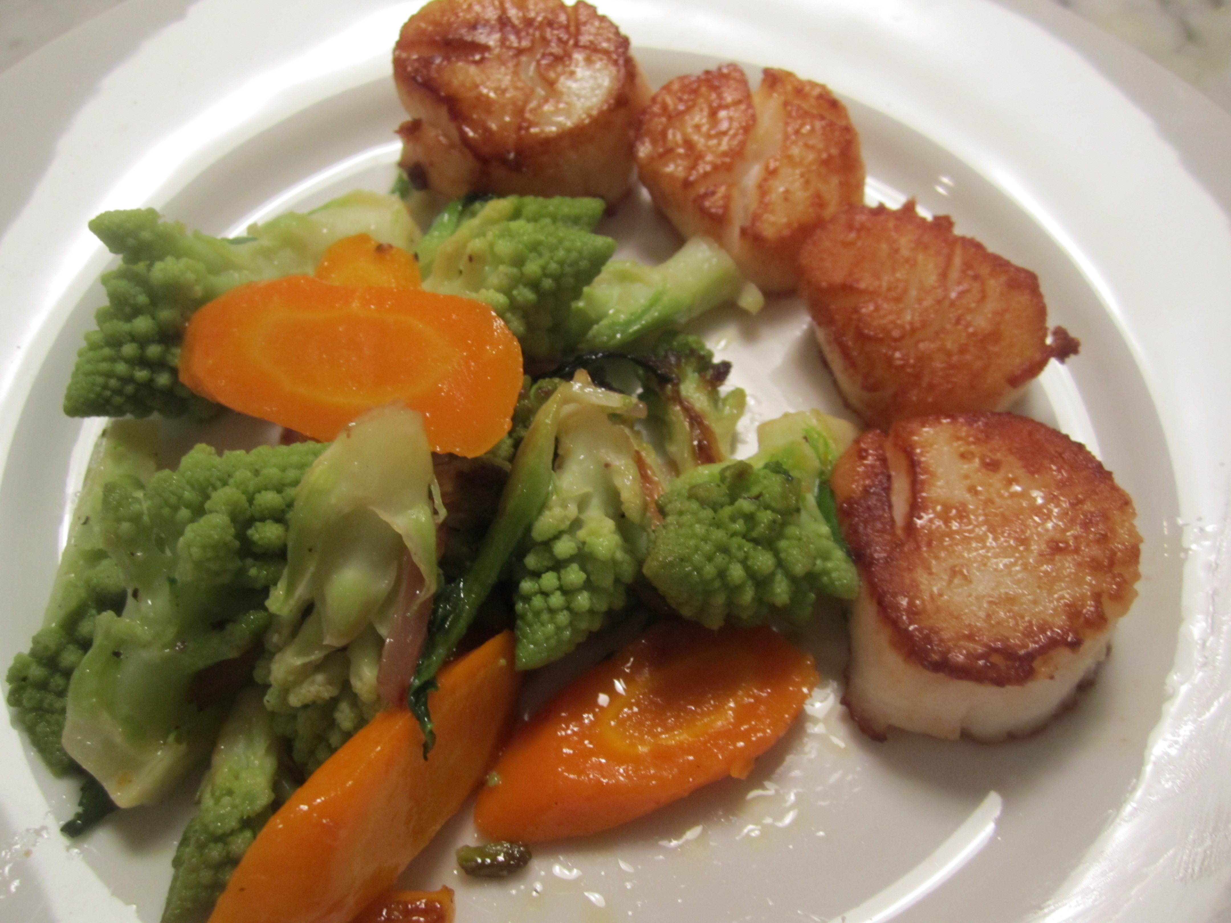As a main course tonight, I served simple seared Montauk Sea Scallops with sauteed Romanesco Broccoli and carrots.