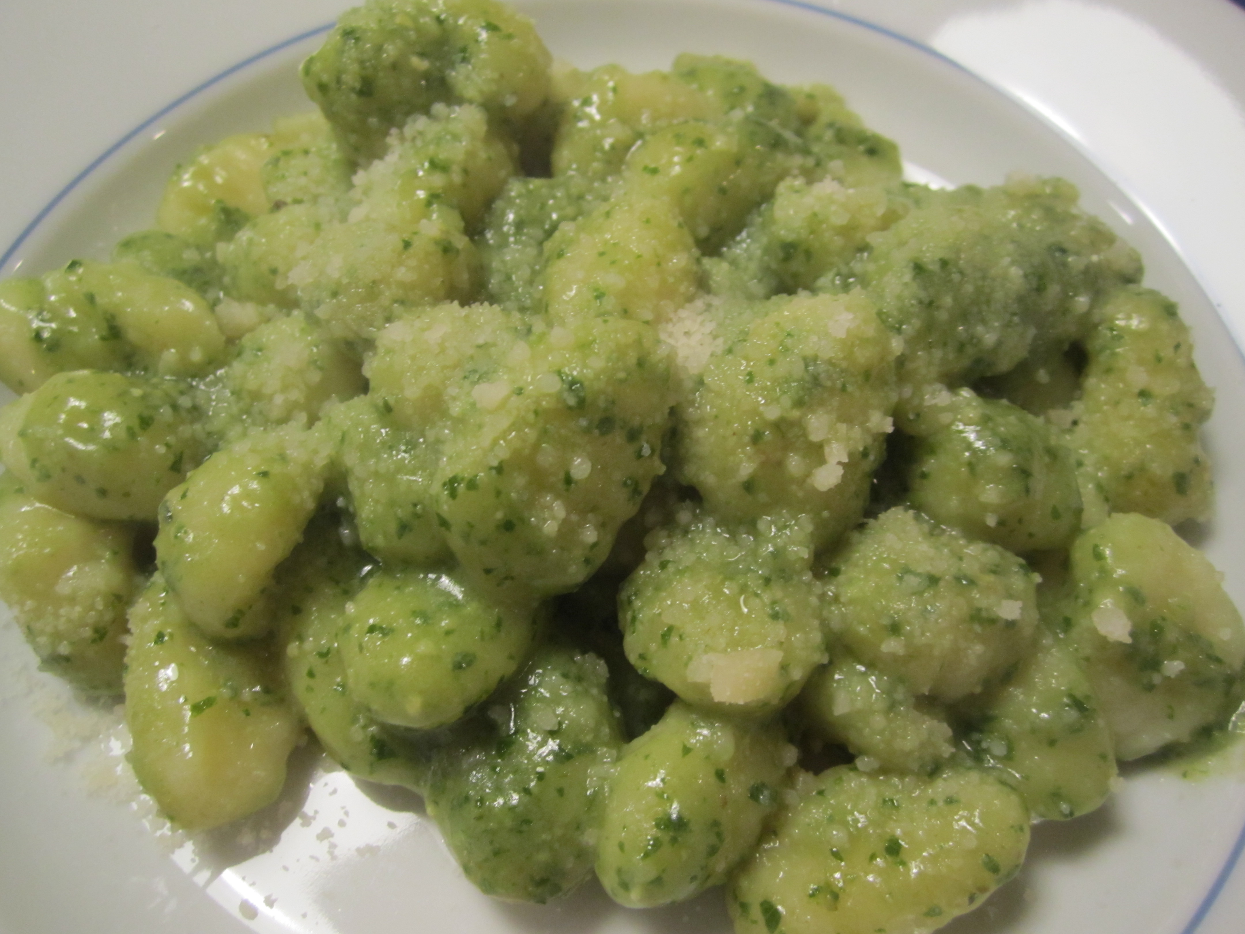 For eight persons, I used the following proportions–4 packages vacuum-packed gnocchi, a cup of pesto, and 4 tablespoons butter. At the last moment, just as the gnocchi are finishing (and not a moment before), the pesto and butter get blended in a large mixing bowl (the heat of the pasta melts the butter), along with a half-cup of the pasta cooking liquid. Toss in hot gnocchi and gently fold and stir with wooden spoon. Immediately spoon into heated individual pasta bowls. The pesto is not cooked, therefore the pasta loses some heat in the saucing process. Once exposed to the air, the pesto will begin browning within minutes, so be sure your guests are seated and ready when the pasta is served. Sprinkle with plenty of grated cheese.