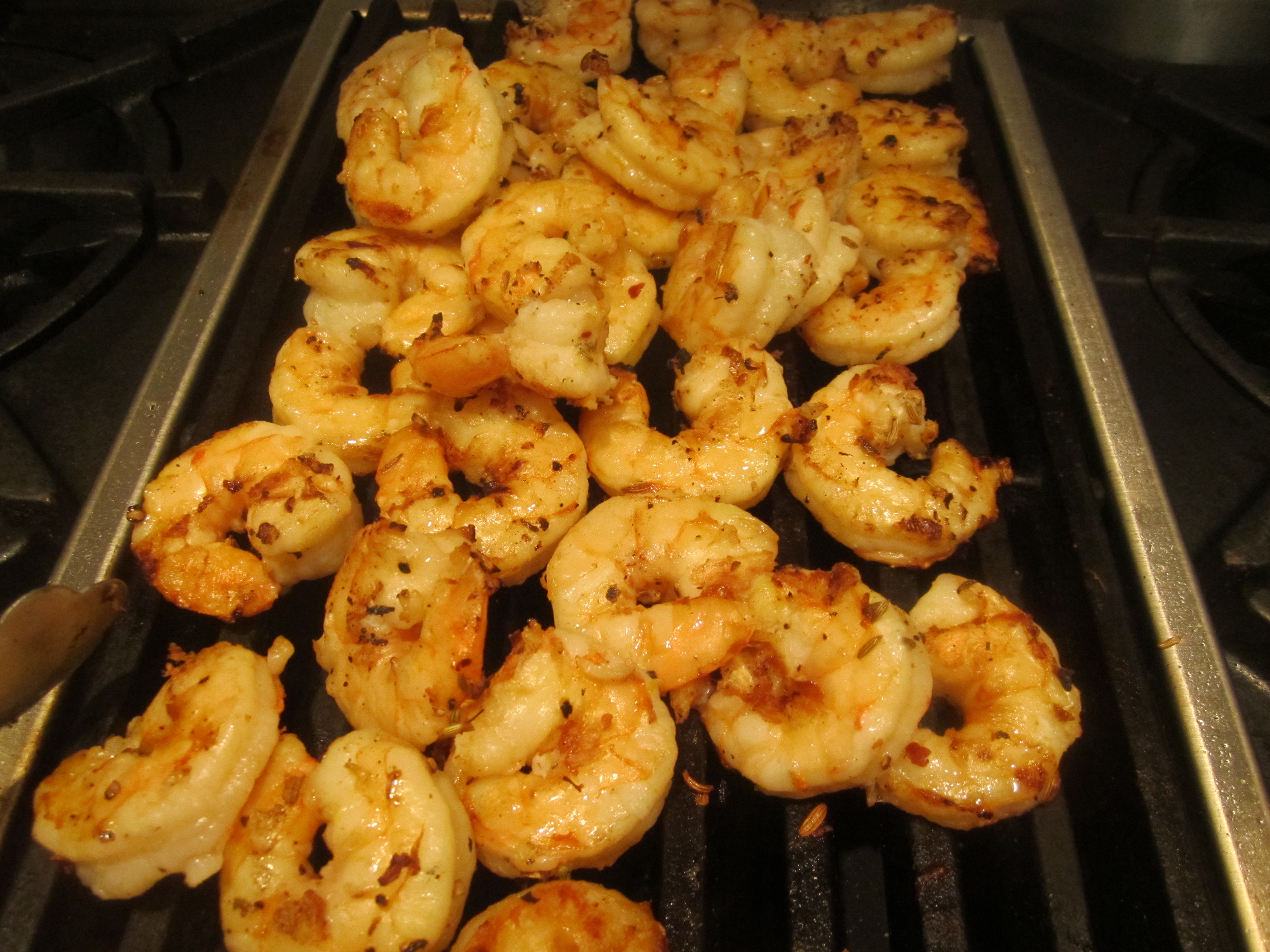 Shrimp fit the bill perfectly. They can be grilled for 2 minutes or so per side with little or no flareups. An hour before dinner, I prepared a little rub, using a about a half-teaspoon each of salt, black pepper, red chili flakes, fennel seeds and lemon zest. I coated the shrimp with the rub and sprinkled with a drizzle of olive oil and let them rest, while we ate our pasta.