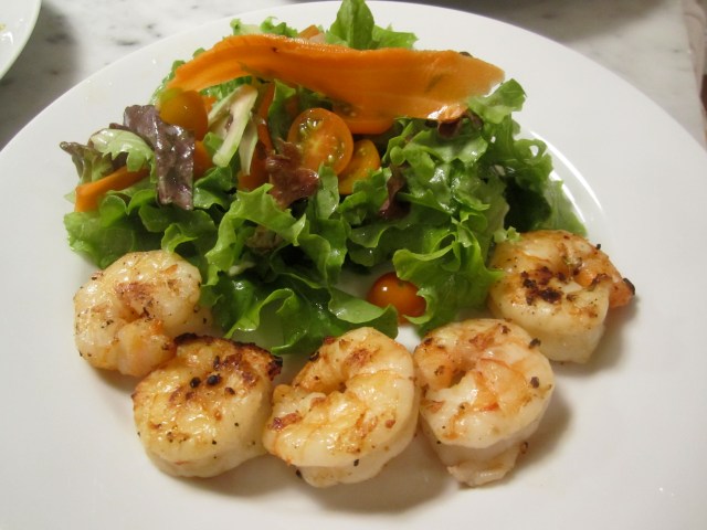 After the pasta plates were cleared, I tossed the shrimp on the hot grill. While the shrimp grilled, I tossed the salad, which consisted of a combination of fresh red and green lettuces, cherry tomatoes, shaved carrots and cucumbers. The dressing was my usual red wine vinegar, olive oil, salt and pepper.