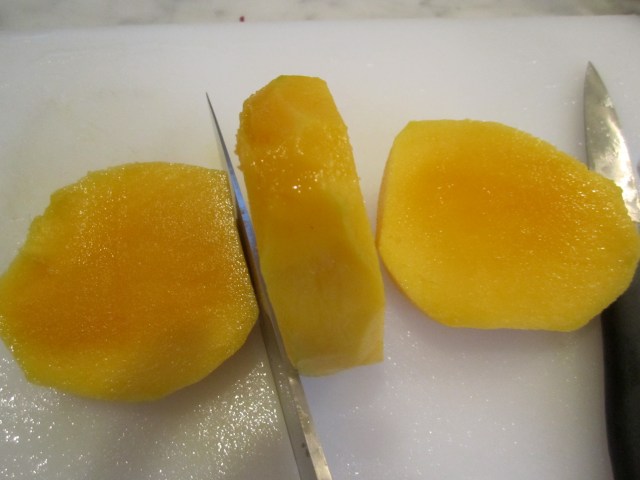 Remove core from mango by standing vertically and slicing around the fibrous core.
