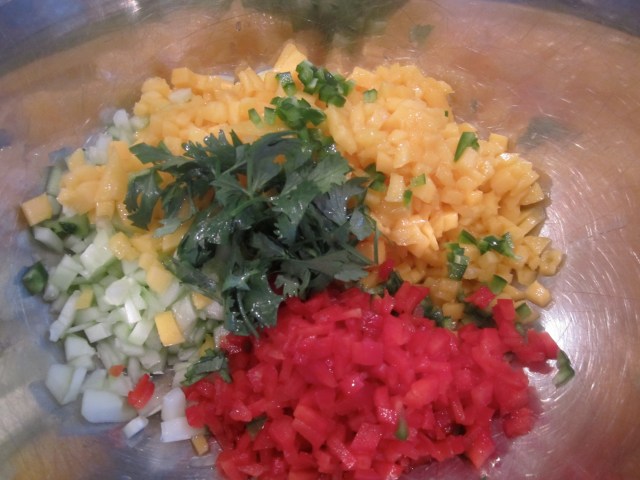 The salsa is very simple and merely requires a little patience with the chopping knife. All ingredients must be chopped to uniform fineness, then dressed with the proper balance of oil, rice wine vinegar (and/or lime juice), and sugar (I used agave).
