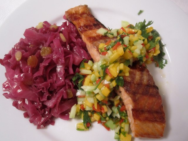 Although I don’t keep turmeric in my cupboard, I decided to approximate the bright flavor sensation of my friend’s dish, by making a raw salsa with cucumber, mango, red pepper, jalapeno, cilantro and rice wine vinegar. This would be the perfect topping for grilled salmon. As an accompaniment to the salmon, I served my red cabbage with pine nuts and raisins (see post below).