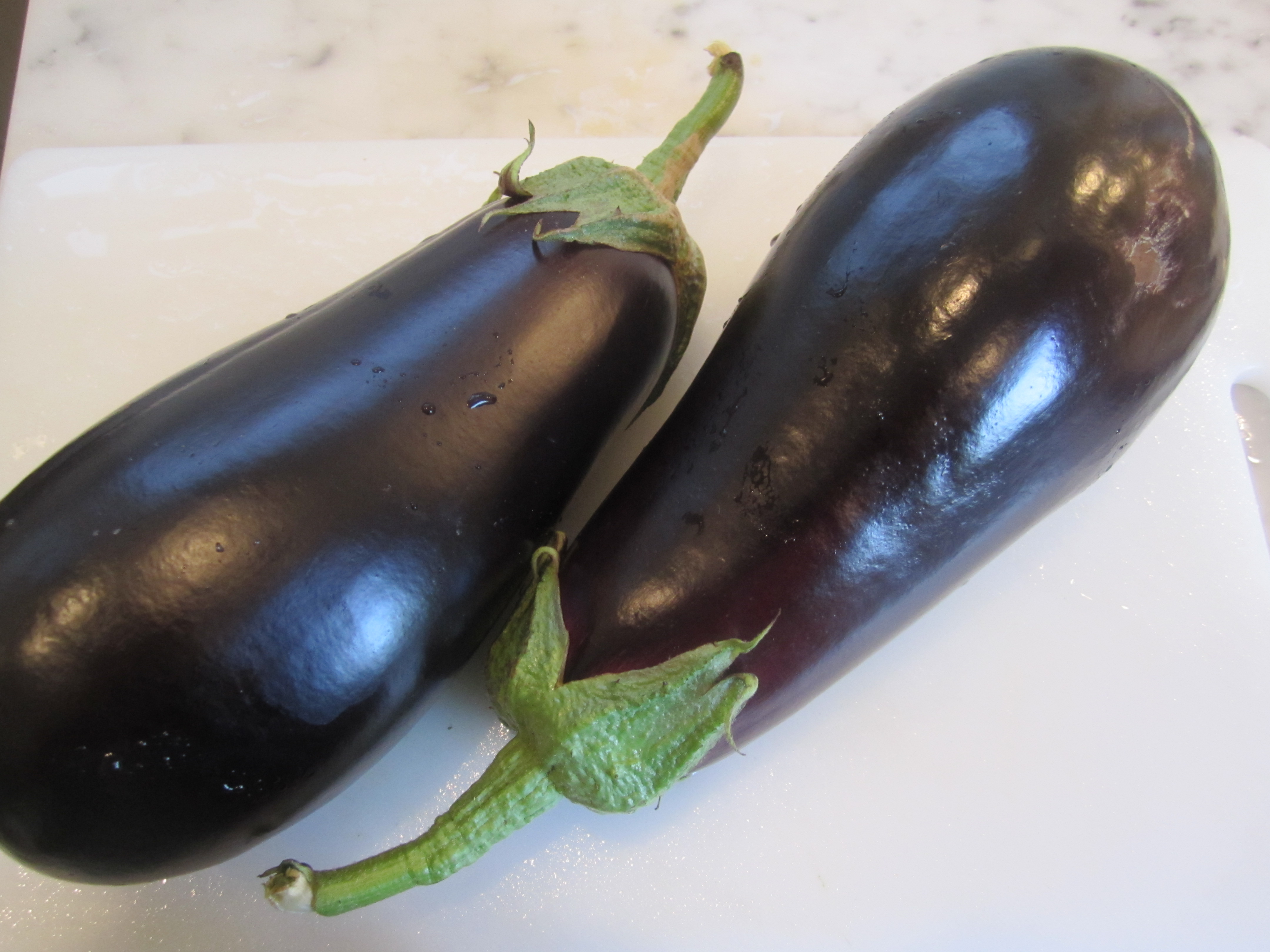 The eggplants at my local farm stand today were flawless–shiny and firm to the touch, without any bruises or puckering.