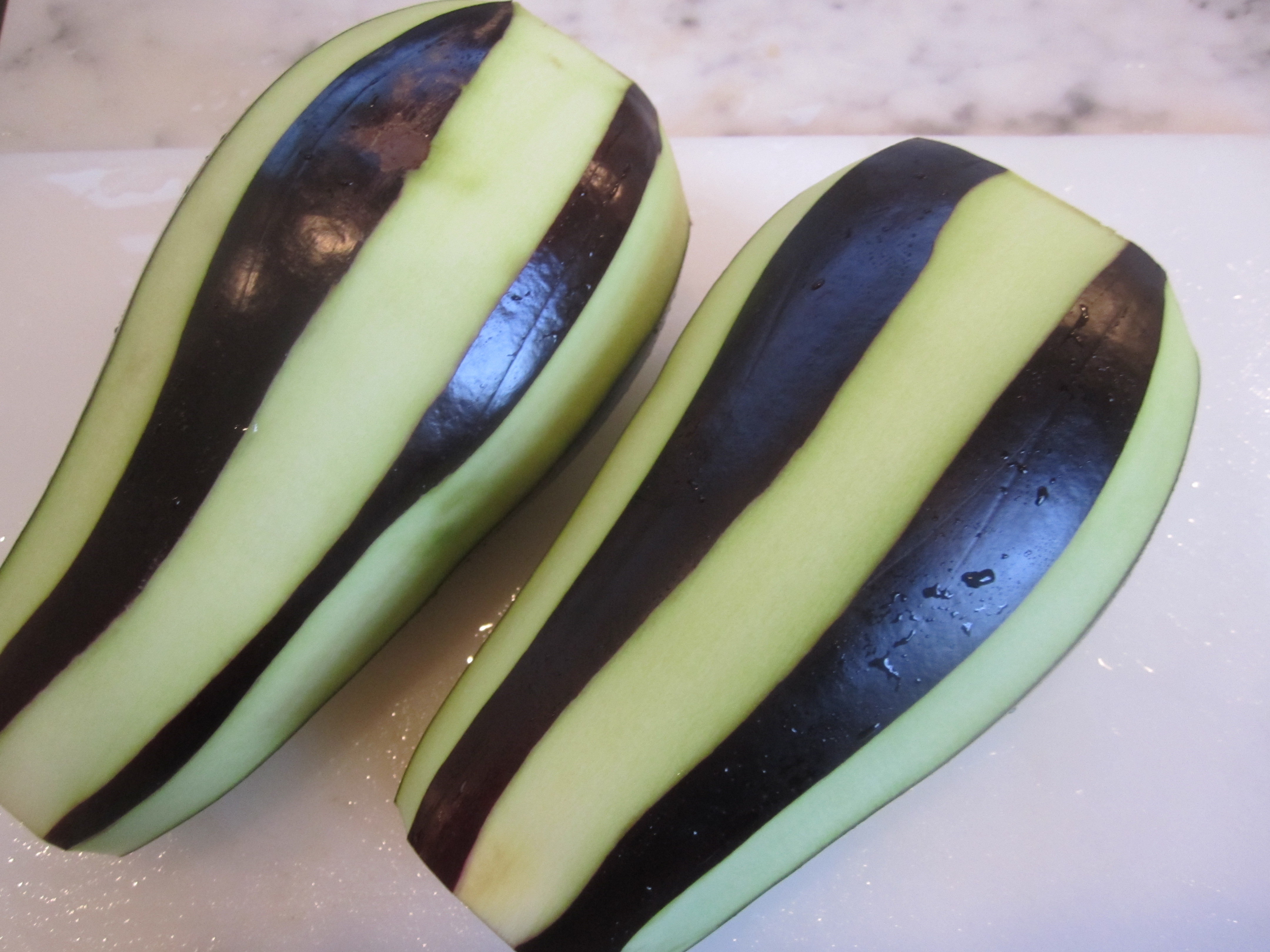 Peel eggplant, leaving some strips of skin on. I like to leave a bit of skin on, since the skin has flavor. If too much skin is left on, however, the pieces become leathery and tough.