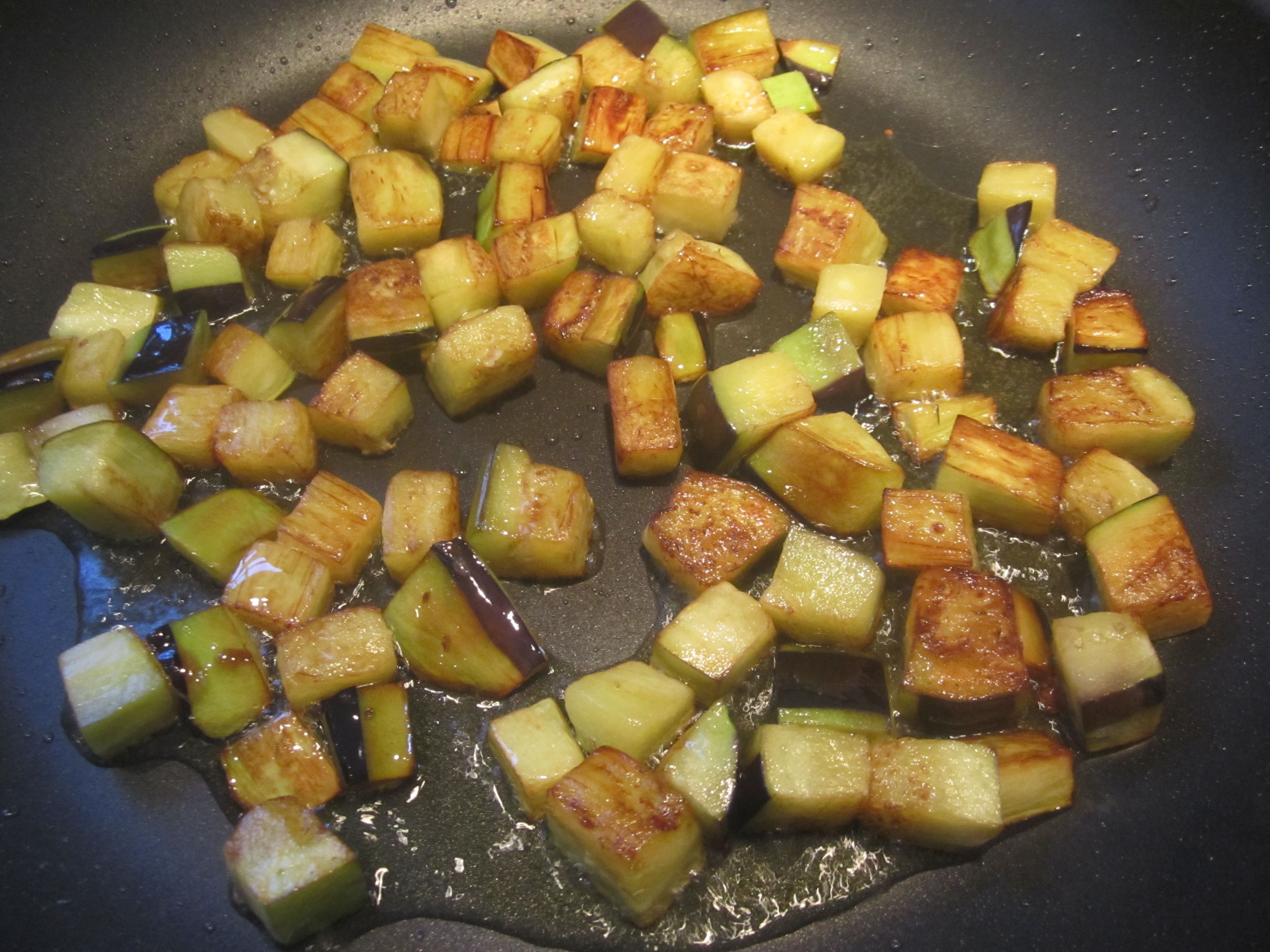 In a broad, nonstick skillet on high heat, place 1/2 cup olive oil. When oil is shimmering and beginning to smoke, add half the eggplant and reduce heat to medium-high.
