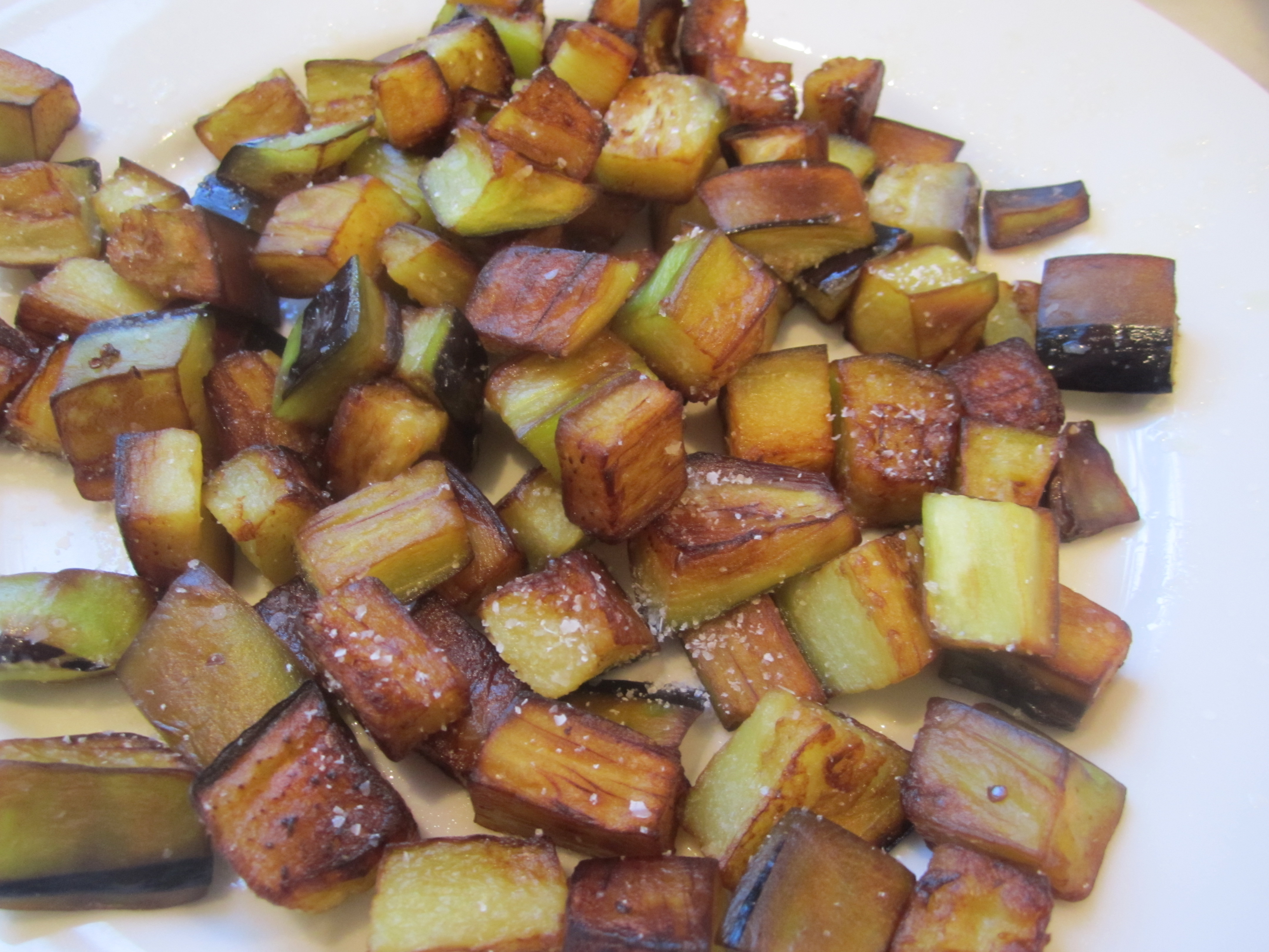 In my experience, the salting and squeezing is unnecessary when using freshly picked eggplants. I have yet to experience any bitterness in my eggplants when buying them in their just-picked state. As for their tendency to absorb oil, although they do absorb a good amount of it when they first hit the skillet, they later release some of that oil as they brown and caramelize. The main reason, however, that I don’t salt my eggplant is that salting and squeezing changes the texture of the eggplant. I’ve prepared fried eggplant both ways and I prefer the texture of eggplant that is fried in its just-diced, unsalted state.