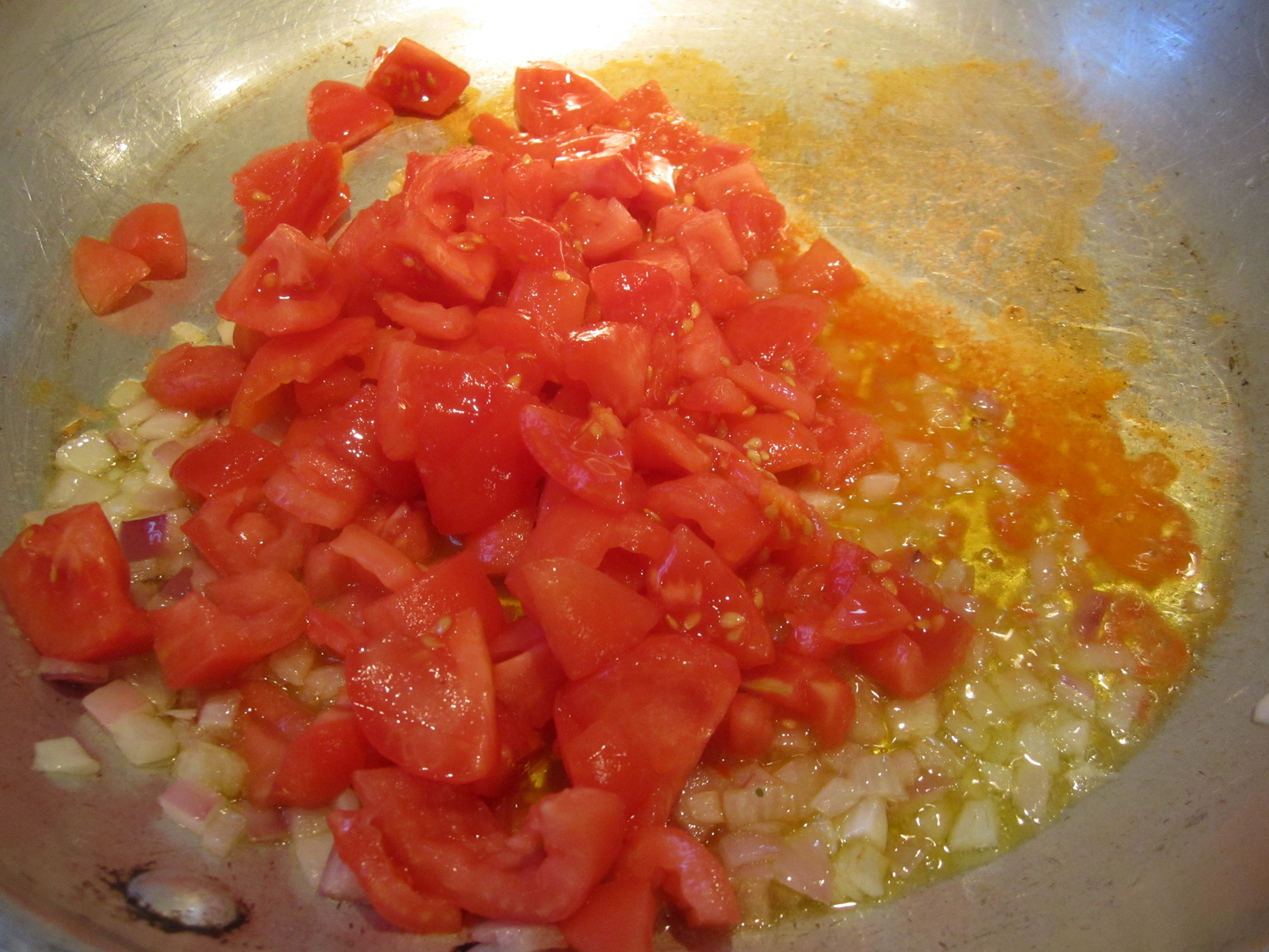 Peel tomatoes by dipping in boiling water for approximately 10 – 20 seconds. The peel should blister slightly and slip off easily with your hands. Dice tomatoes into roughly 3/4″ pieces. In a skillet large enough to hold the entire finished dish, on low heat, saute onion in remaining quarter cup of oil until translucent and soft–approximately 10 minutes. Sprinkle with a bit of salt, then add tomatoes.