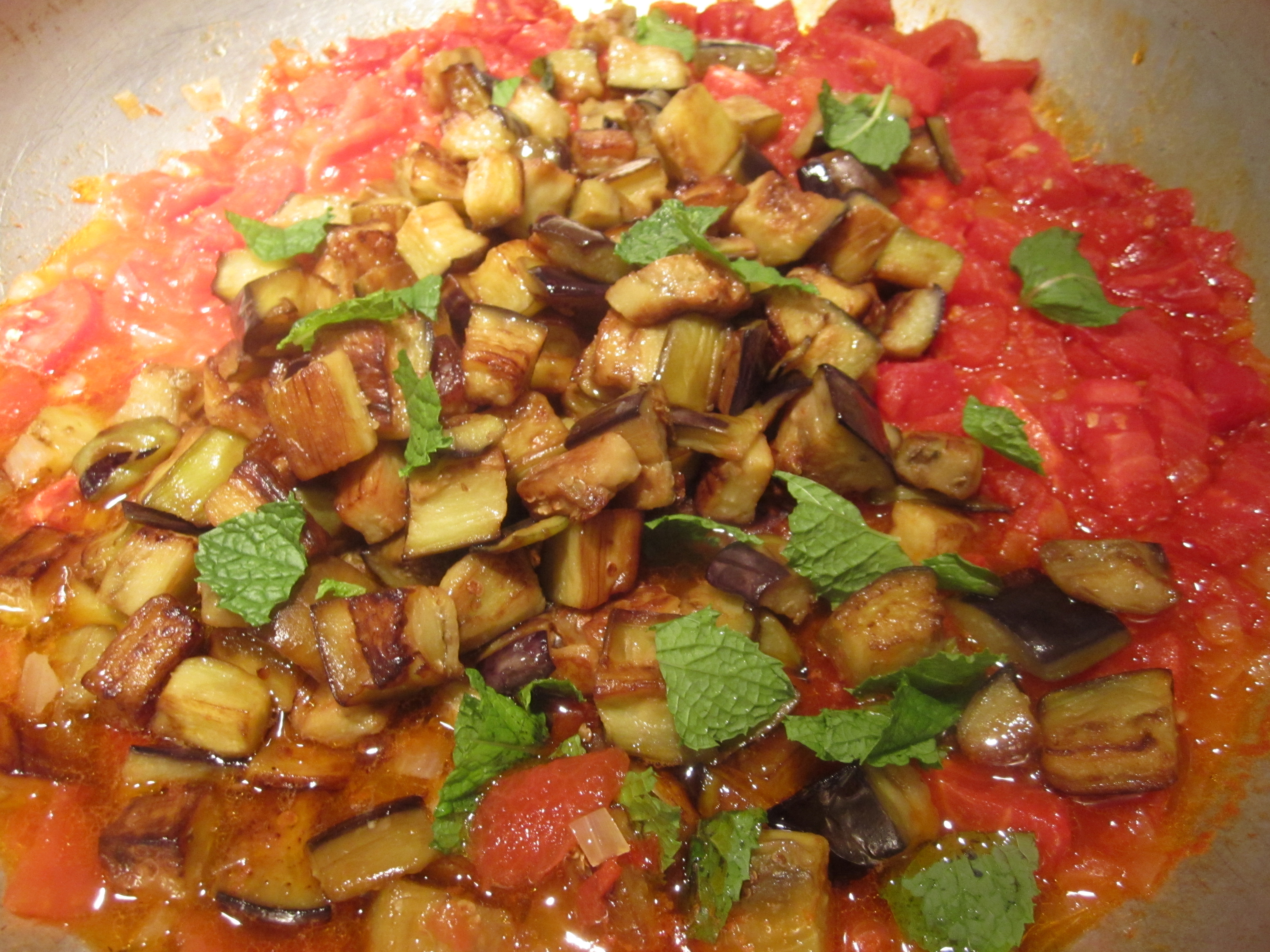 Boil pasta in salted water until a minute shy of done. Add eggplant to skillet with tomato sauce. Top with mint.