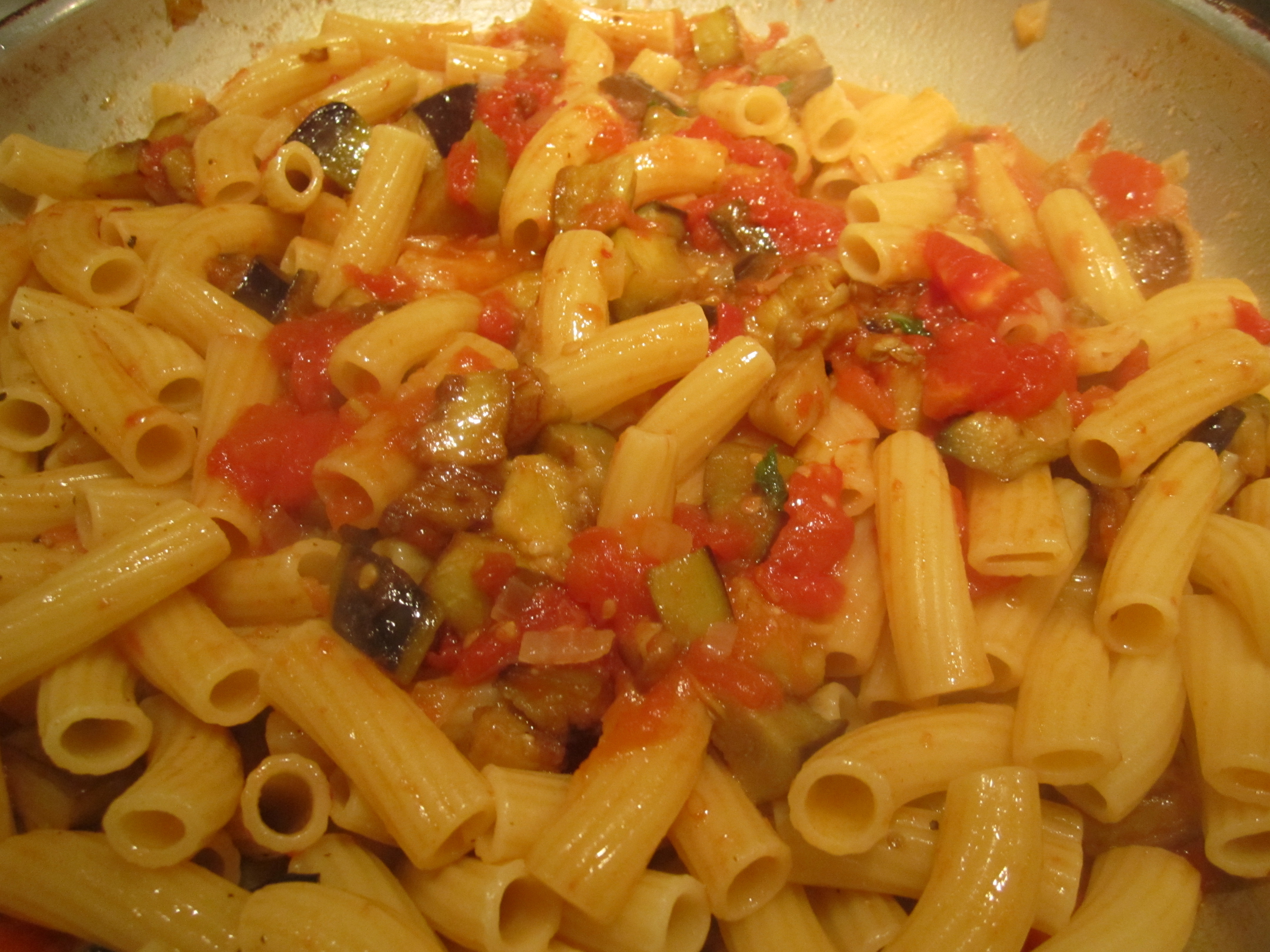 This time of year, eggplant is at the front and center of many of my meals. This is my version of a classic pasta dish with fried eggplant, tomato and ricotta salata.