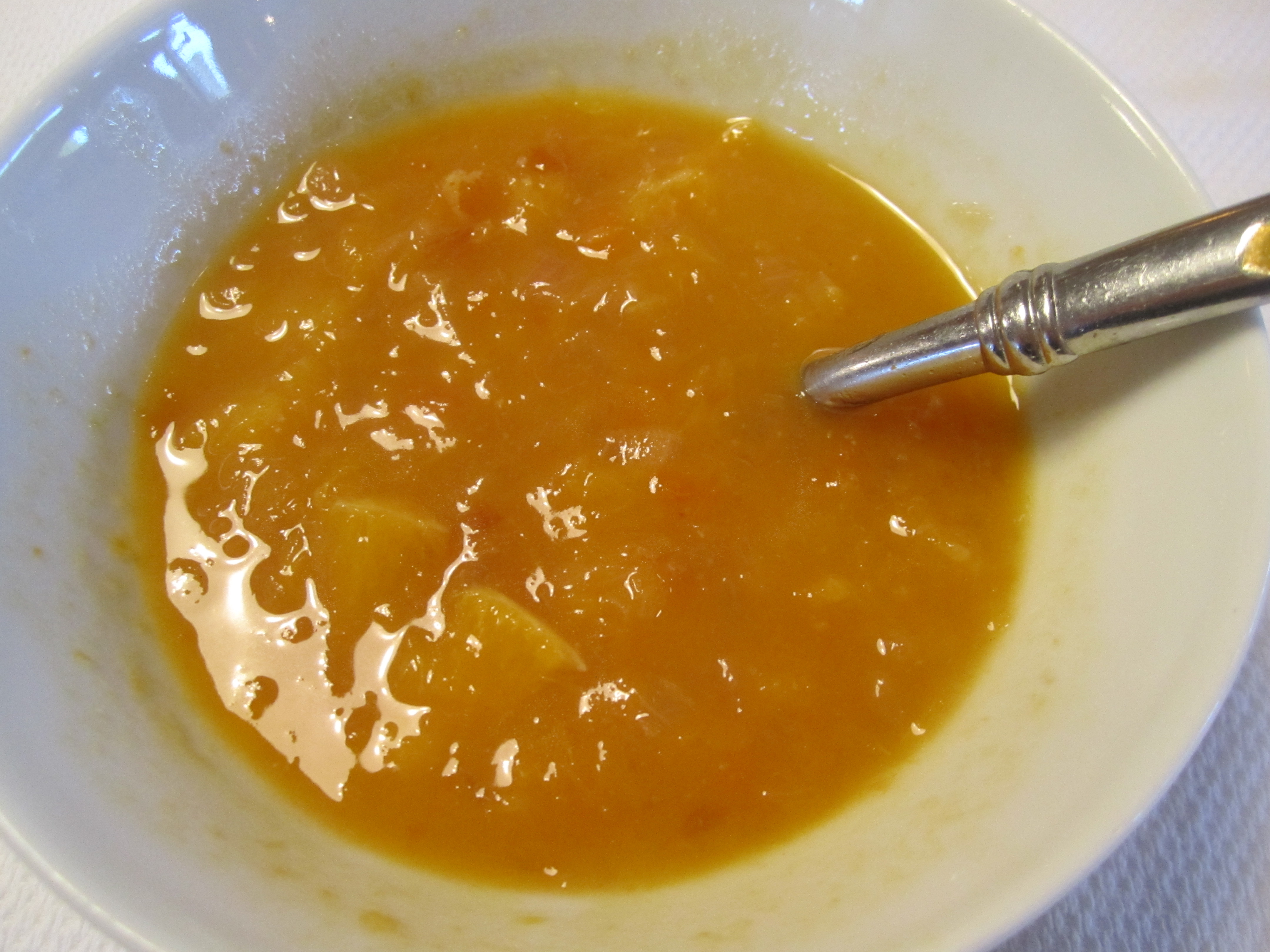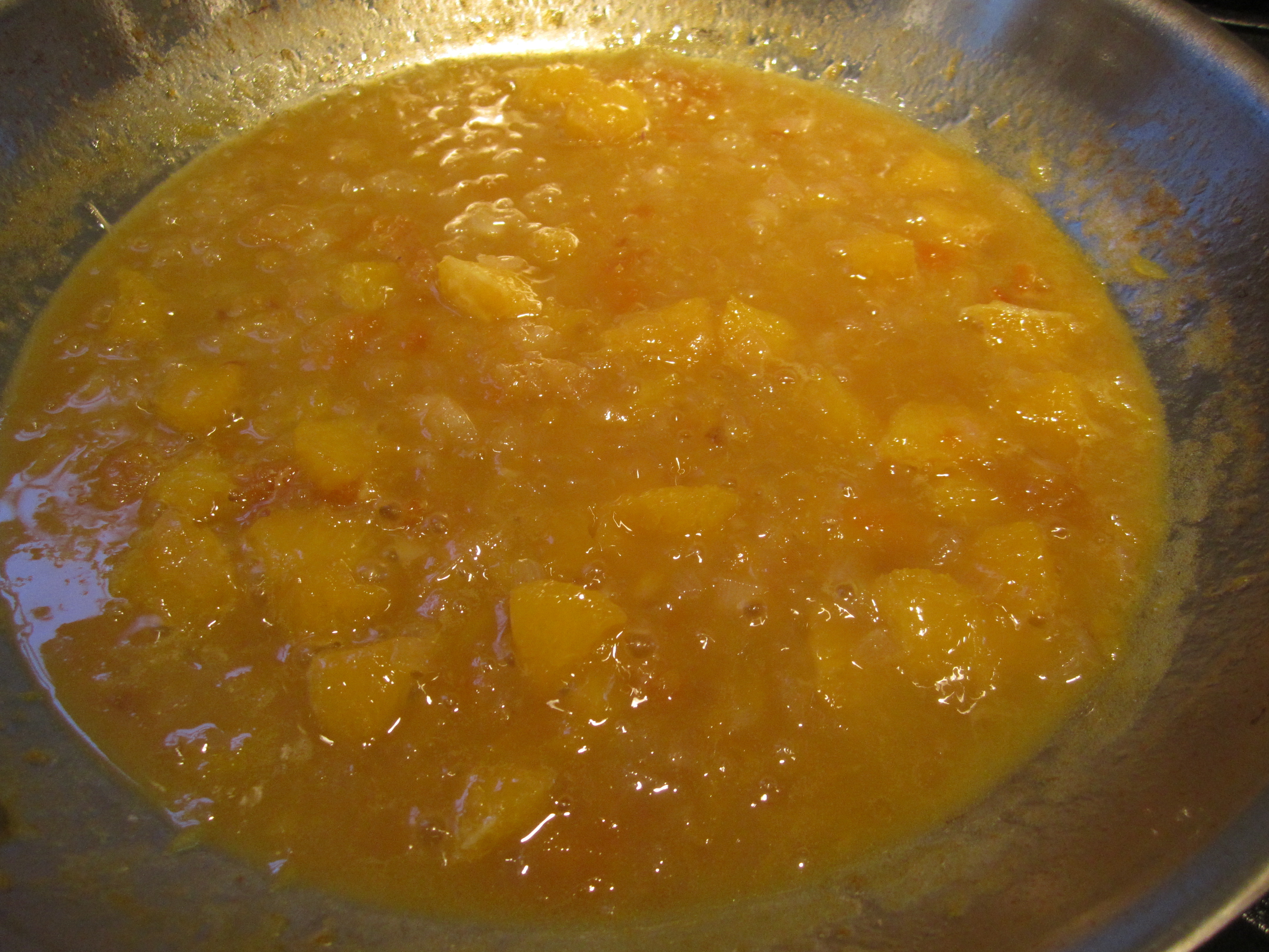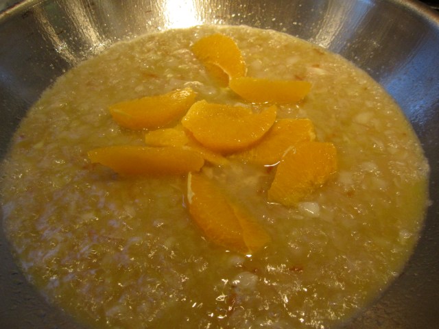 Meanwhile, I make the orange glaze, which consists of shallots, white wine, rice wine vinegar, orange juice, and orange marmalade. The shallots are slowly cooked in oil until soft and melting, then white wine and vinegar are added and reduced. Then orange juice, orange sections, marmalade, and chicken broth are added. The mixture is simmered for about 15 – 20 minutes until syrupy. It’s difficult not to eat it with a spoon before it even before it touches the turkey.