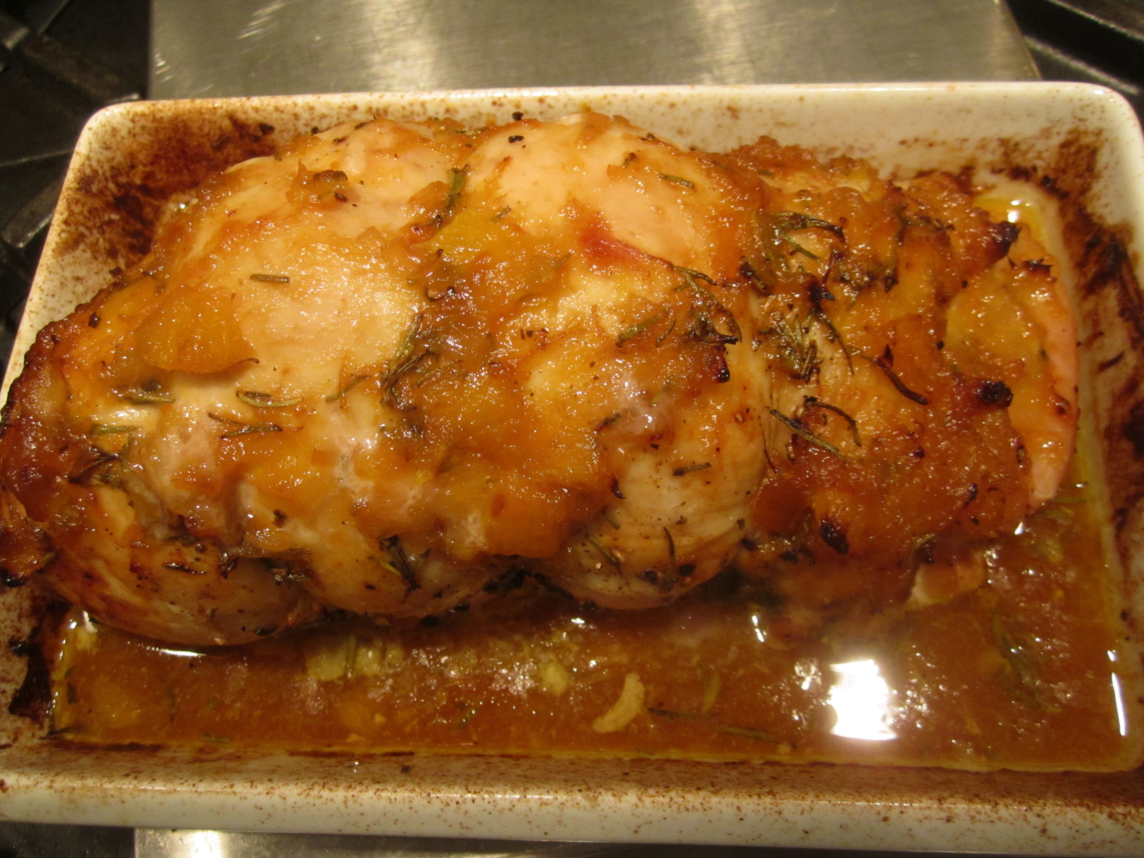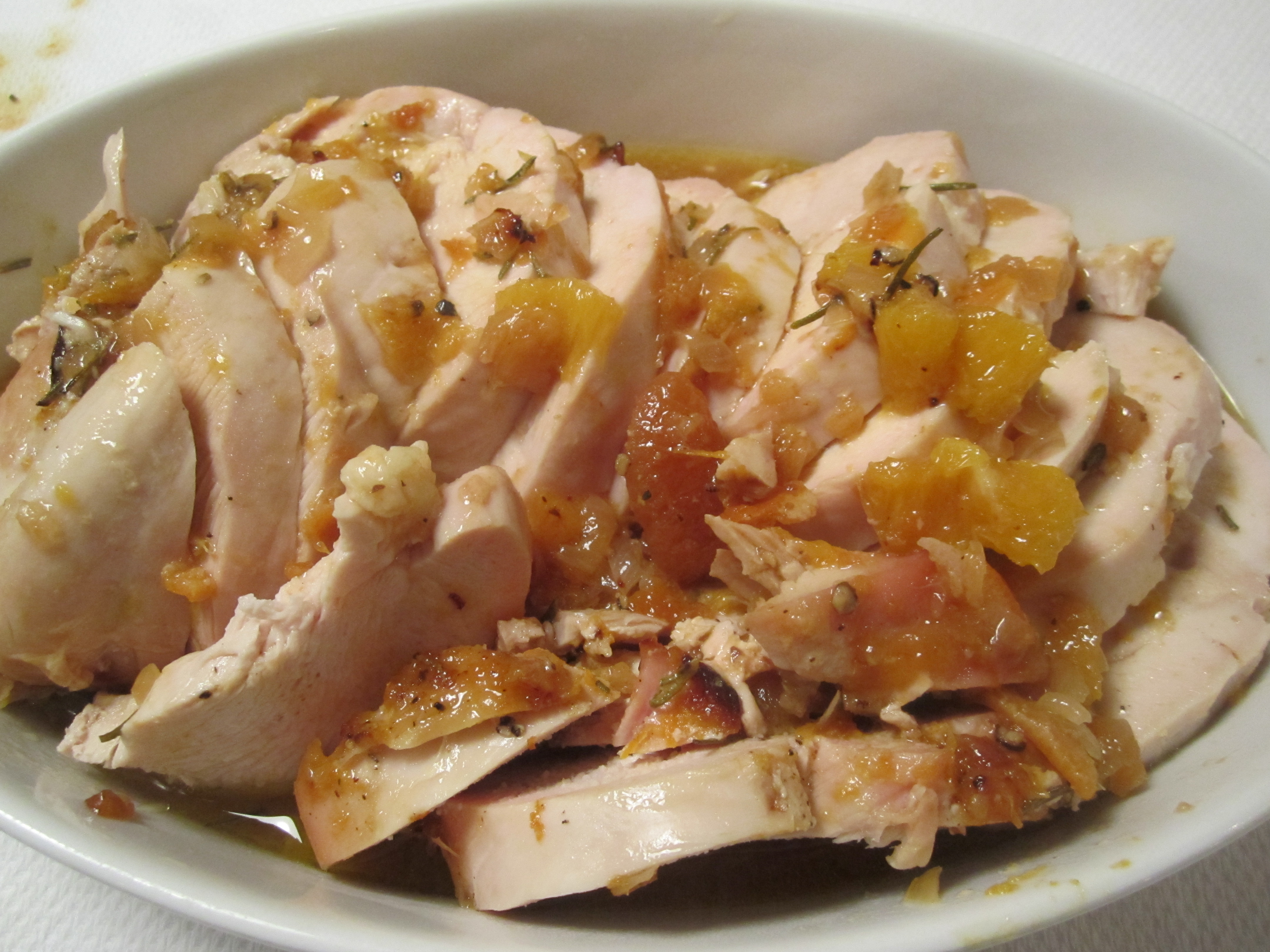 This is a wonderful main course for dinner, that can also provide you with wonderful leftovers for lunches the following days. As a main course, I serve it with the skin on, dressed with some of the orange glaze. After dinner, I remove the skin, slice the meat and nestle the slices in the pool of glaze and pan juices. The bright, sunny citrus permeates the meat and the flavor gets better as the slices sit in the glaze over the course of several days.