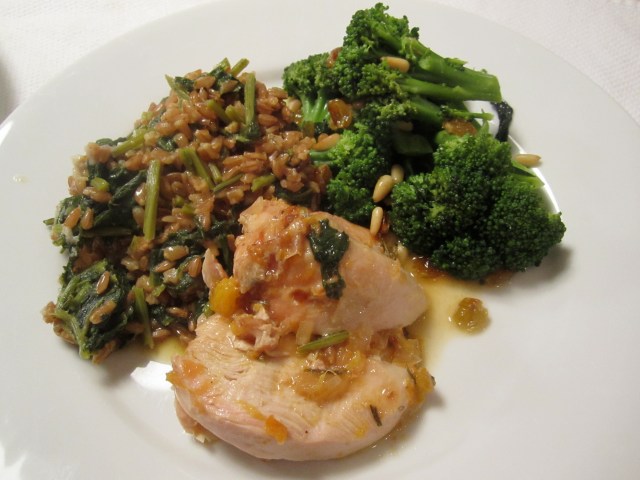 Tonight, in addition to the turkey breast, we had farro with beet greens and broccoli with pine nuts and raisins. All three of these dishes will make for wonderful lunches in the days to come.