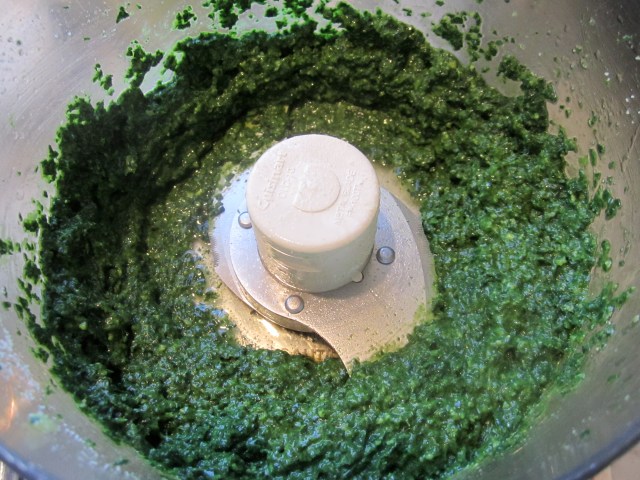 The pesto is made by stripping the kale off the stems and boiling, then combining with the other ingredients and processing to a coarse puree.
