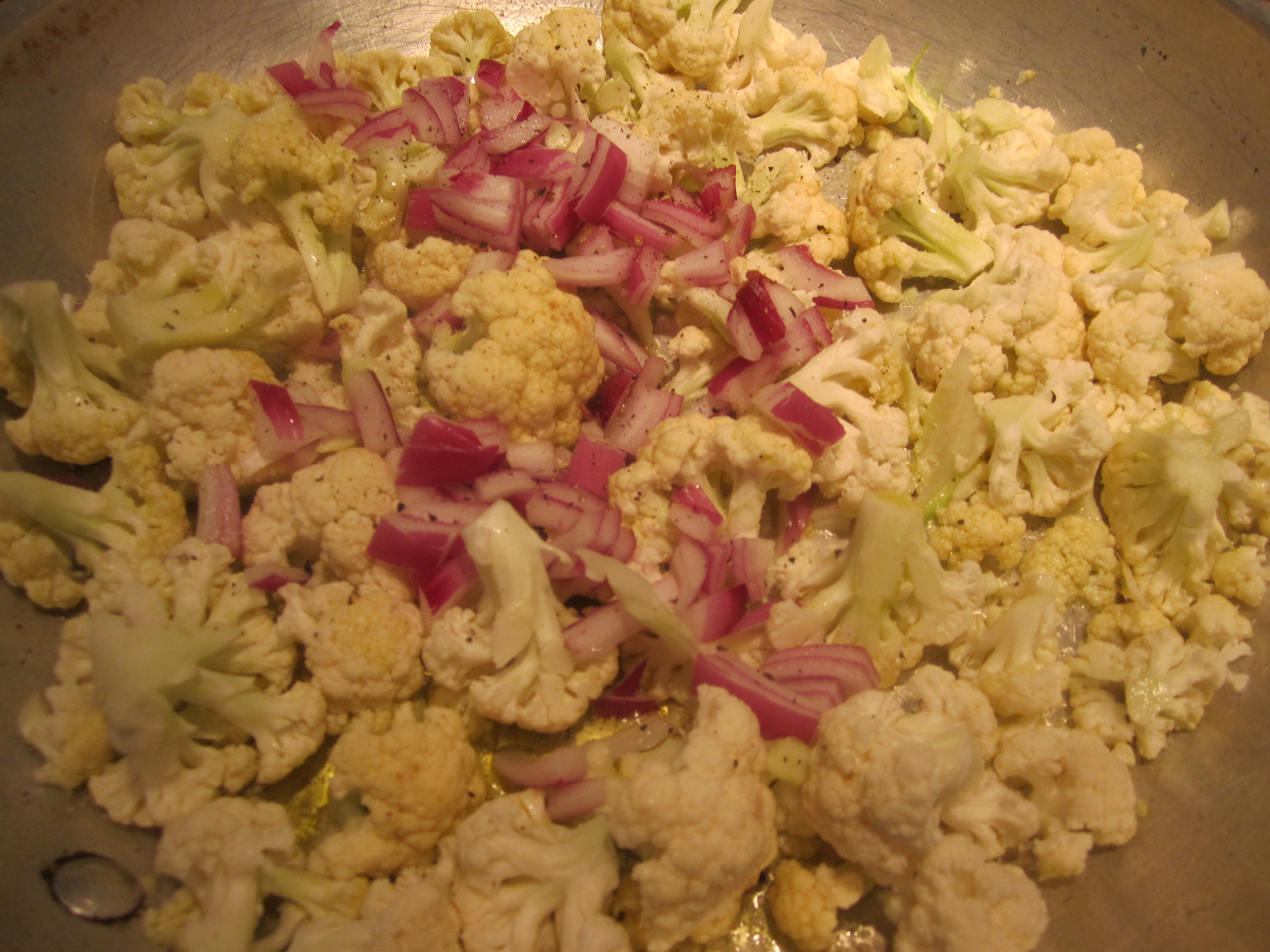While quinoa cooks, place cauliflower and onion in a skillet with olive oil. Sprinkle with salt and pepper.