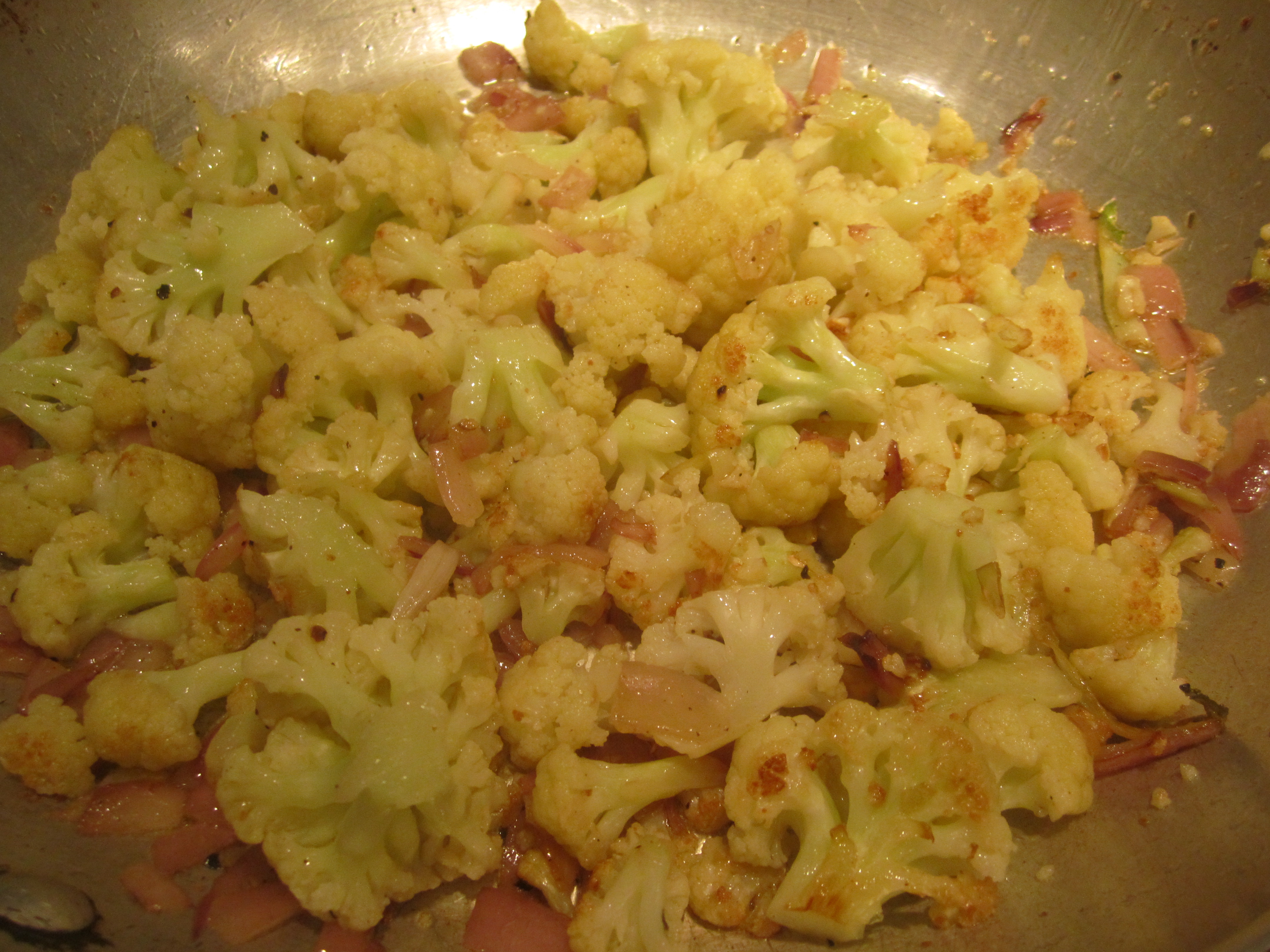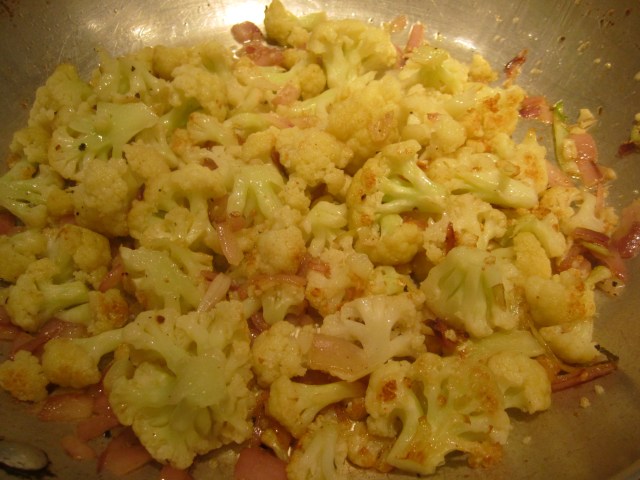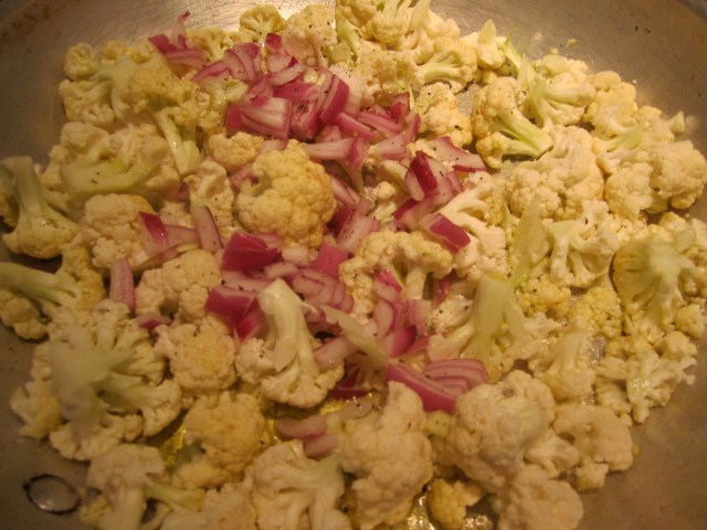 Cauliflower is so nutty and becomes so beautifully golden with so little effort. I’m always inclined to make it with pasta or some other grain. It simply needs to be cut into small florets and sauteed with olive oil to soften and caramelize it. Tonight, I’ve added onion for sweetness. Together, they cook, covered over medium-low heat, until both are golden and slightly soft.