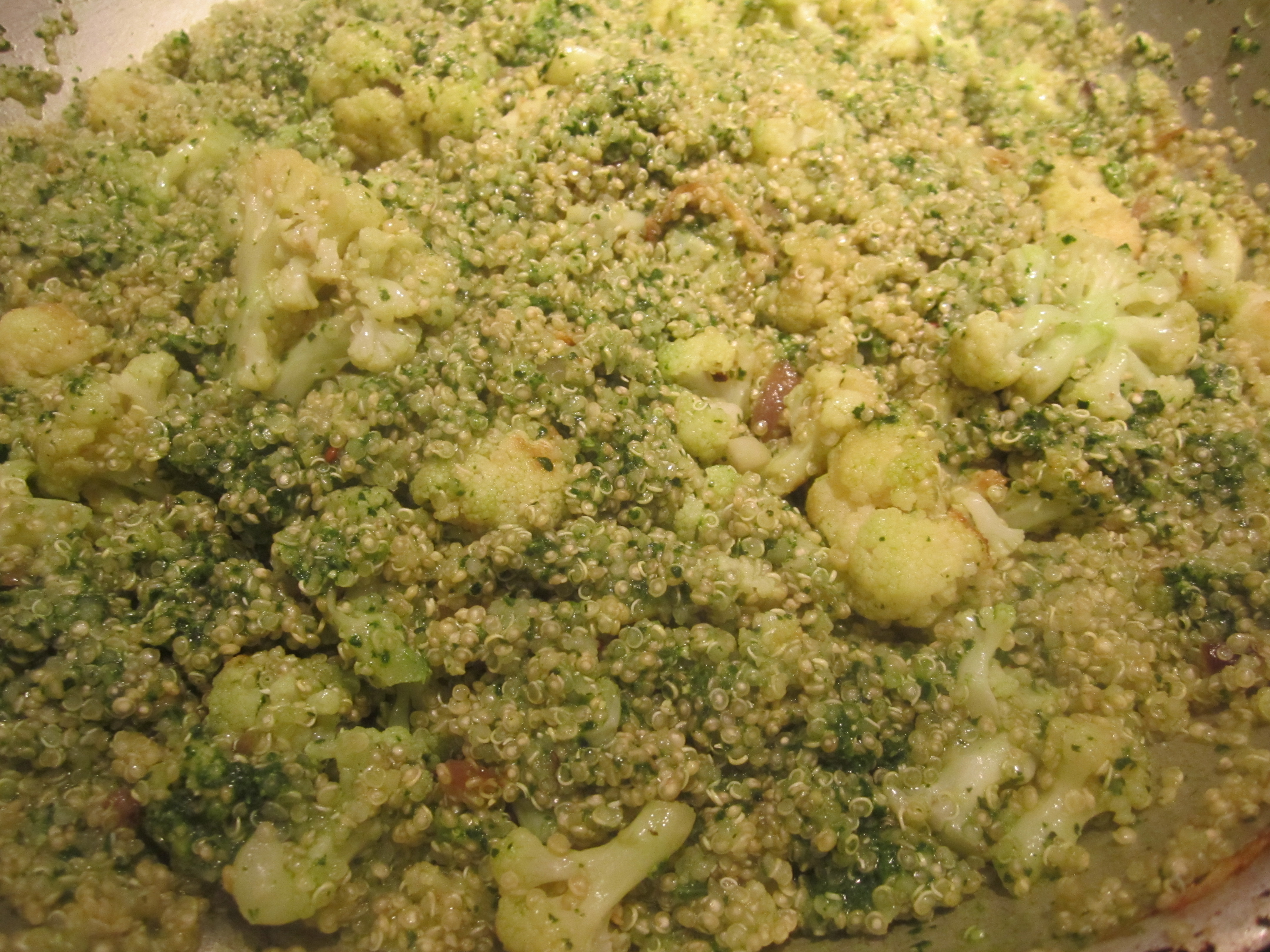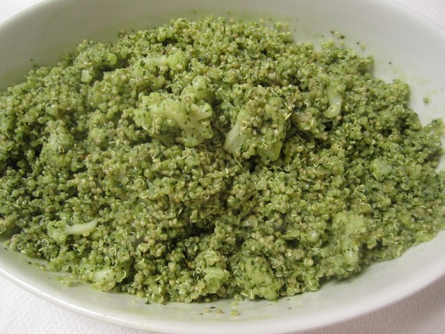Drain quinoa and pour over cauliflower, along with some of its liquid. Add pesto.