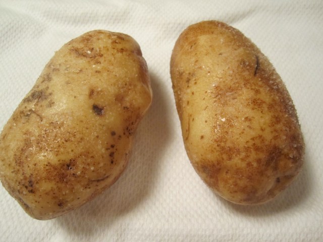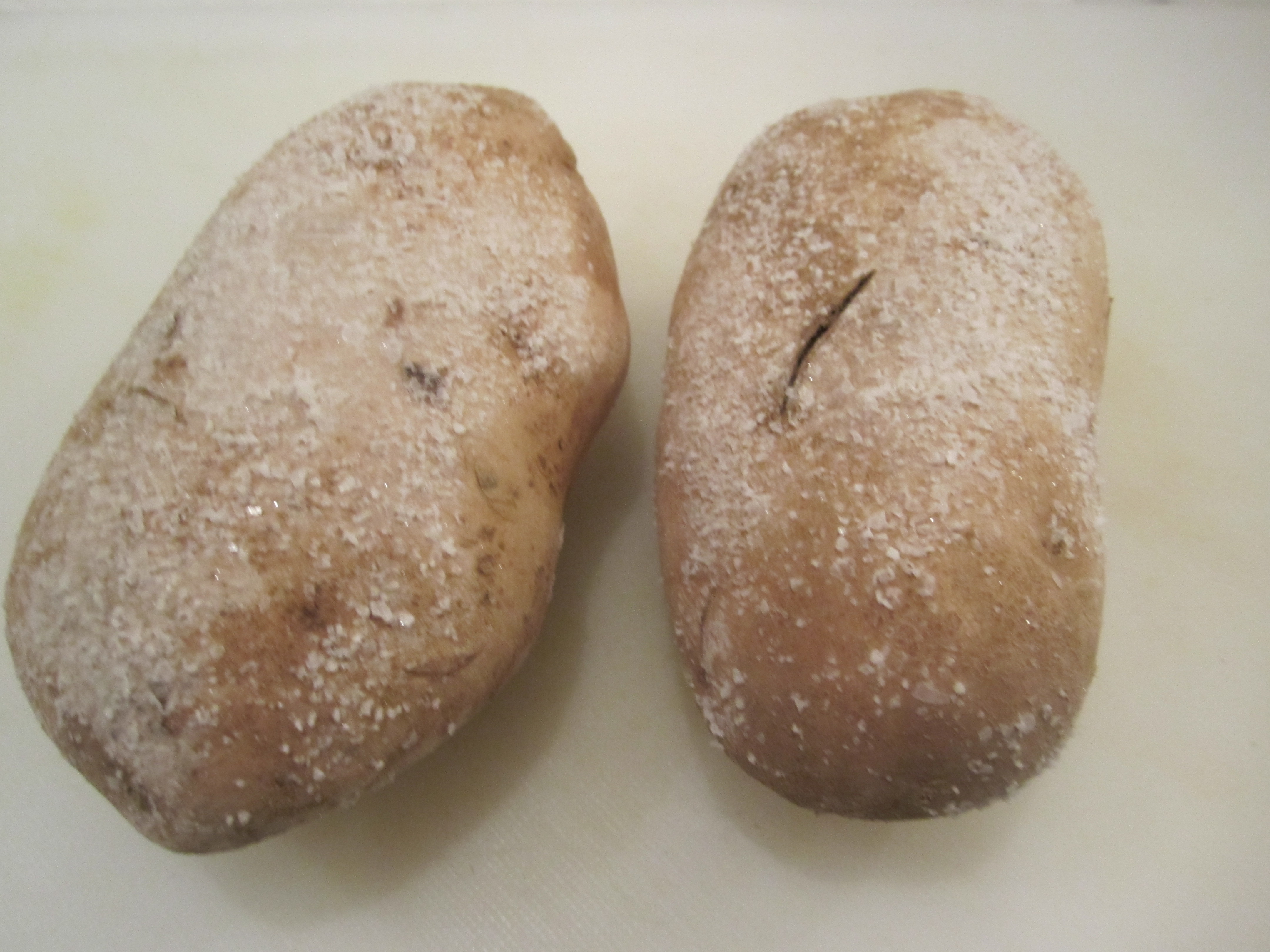 Wash potatoes and poke a couple of holes in each one with a knife or fork. While still wet, sprinkle with a light coating of kosher salt.