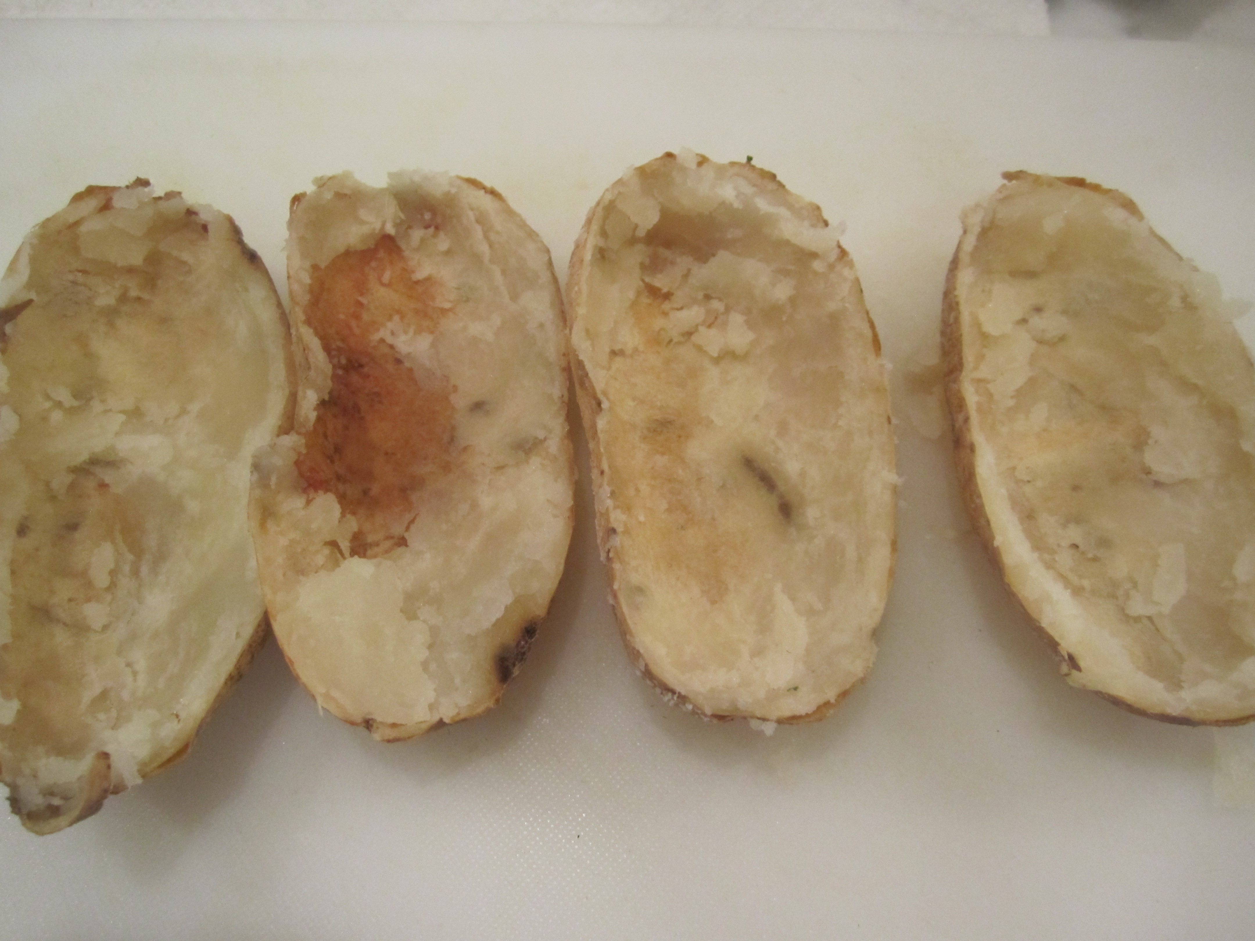 Slice potatoes in half lengthwise and with a spoon, scrape out the filling and set aside.