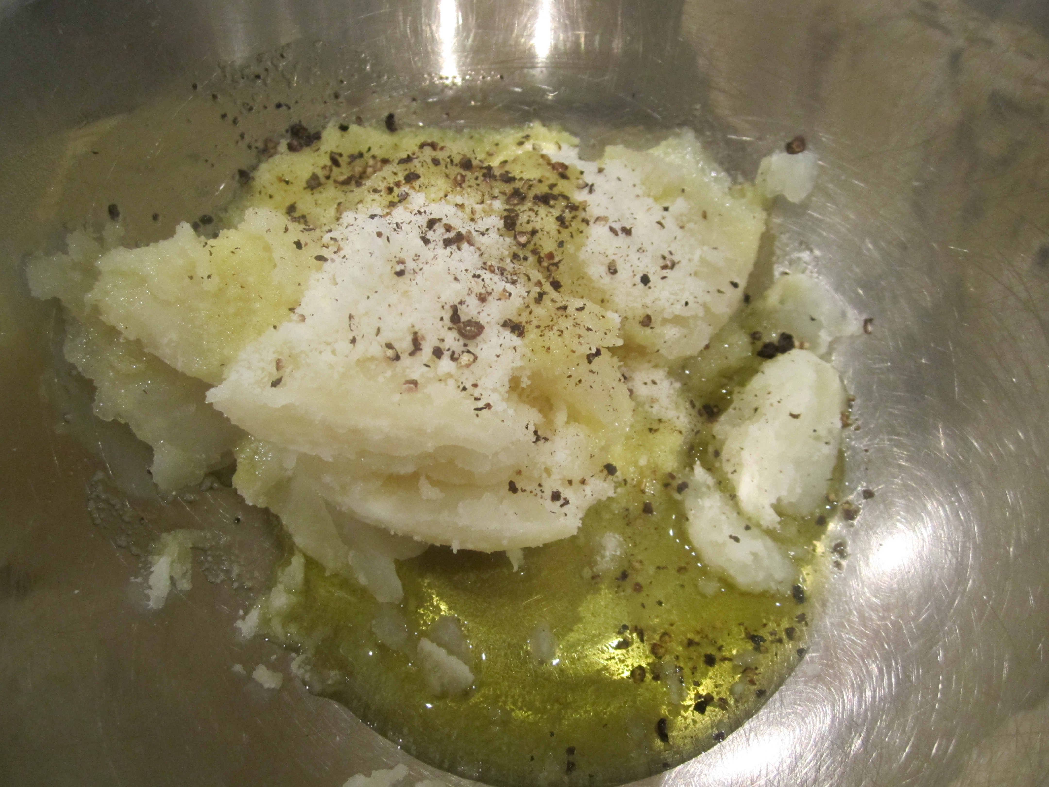 To the potato filling, add 1/4 cup pecorino, 3 tablespoons olive olive oil, and the black pepper.