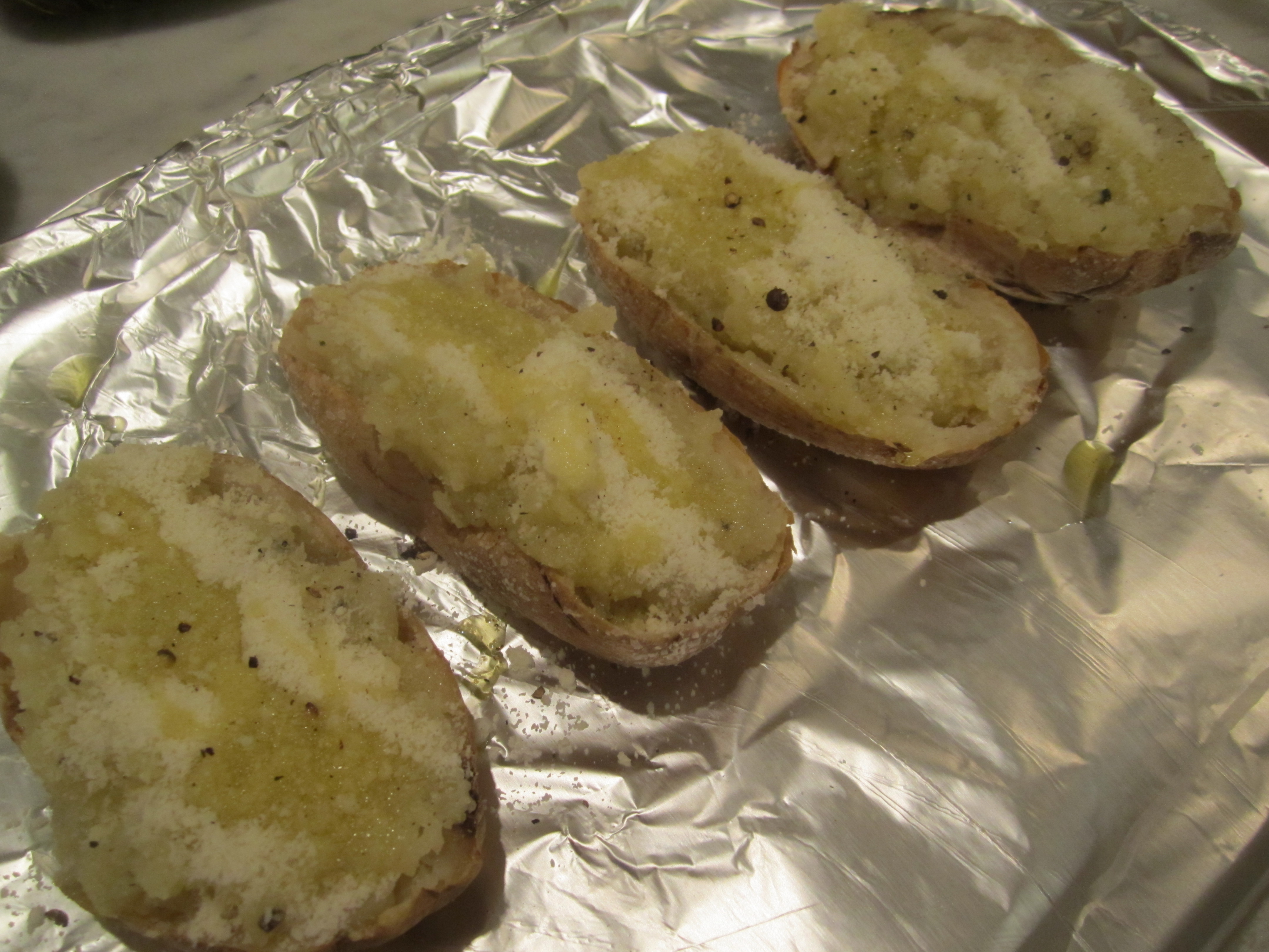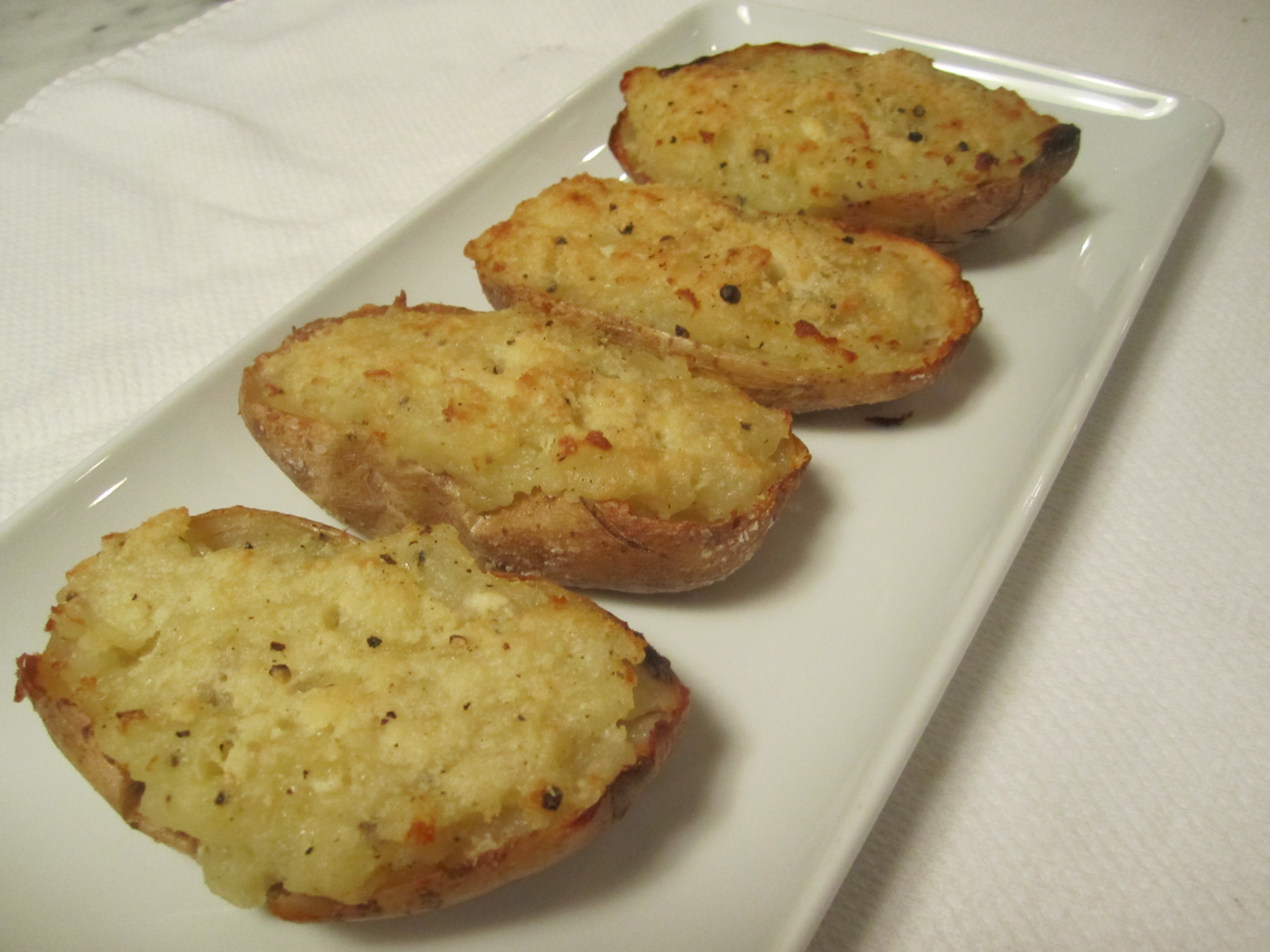 I was in the mood for baked potatoes, and tonight, I decided to dress up our baked potatoes by scooping them out of their skins, mashing them with pecorino, olive oil and black pepper, then returning them to their skins to bake a second time.