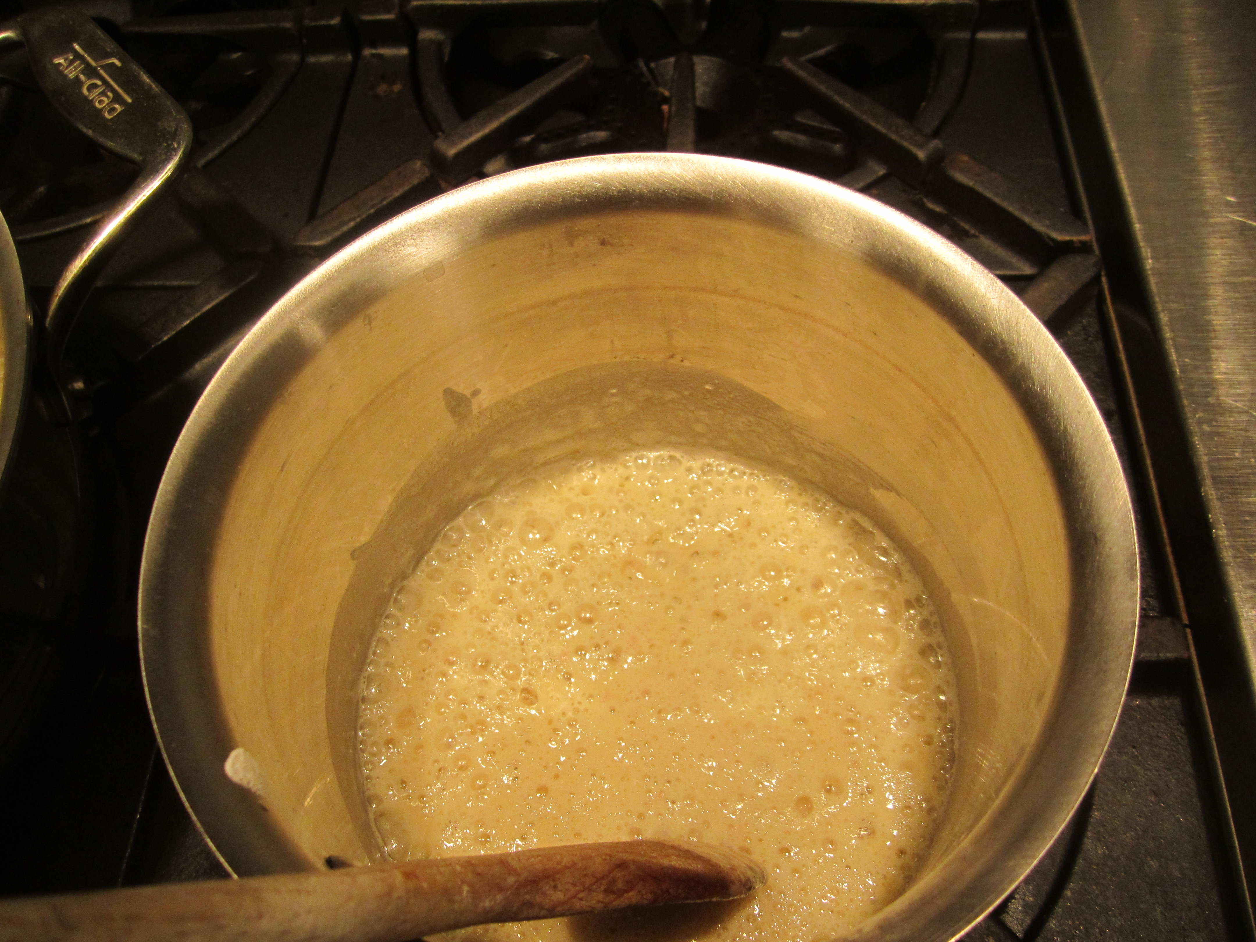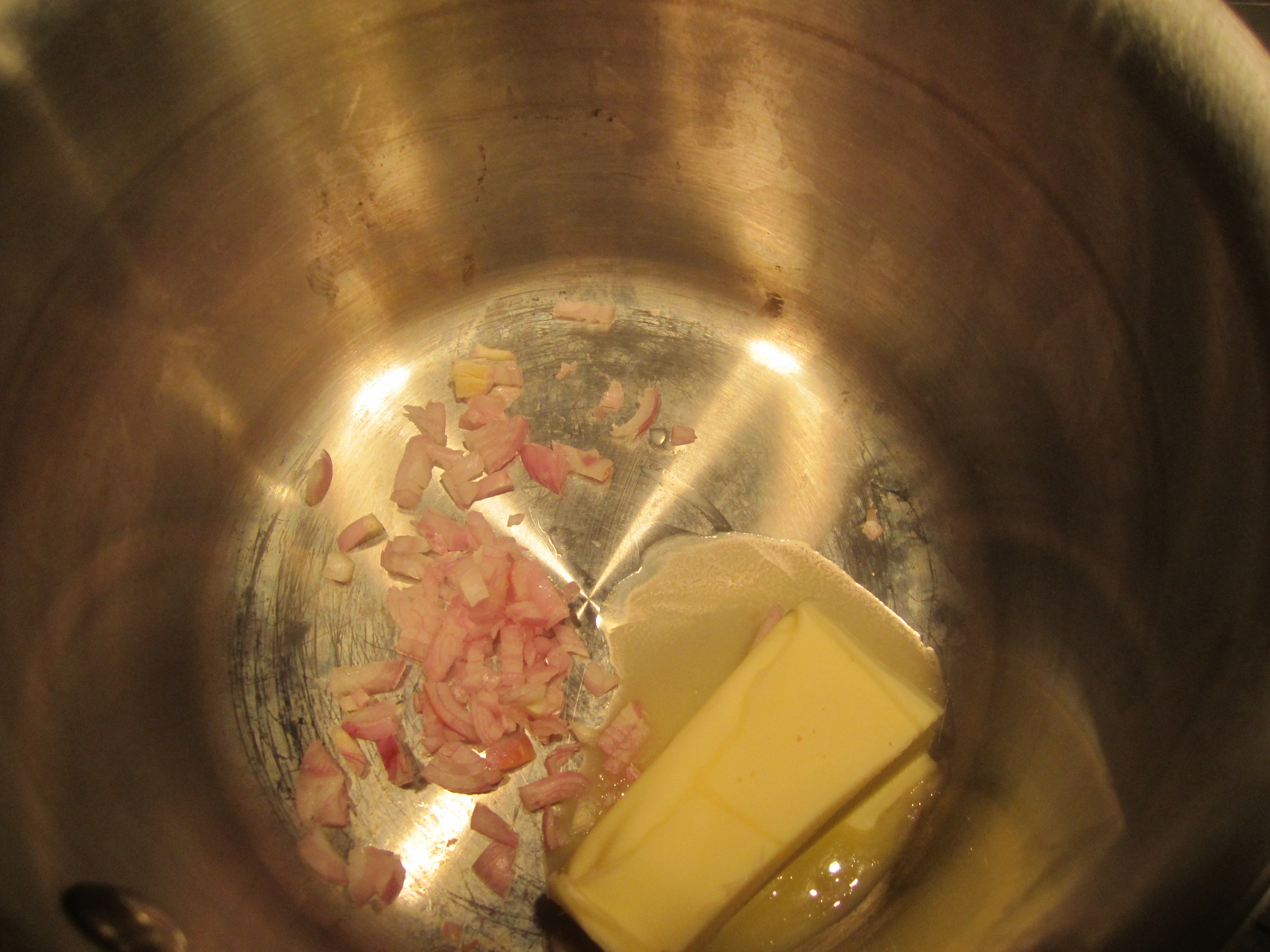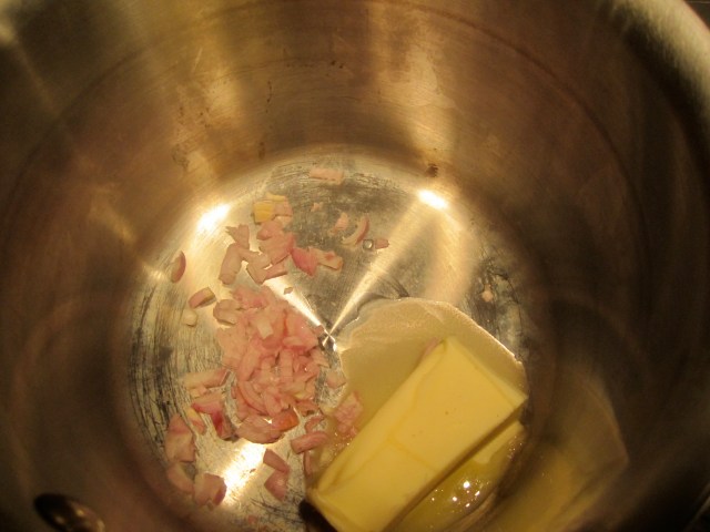 While waiting for water to boil, make bechamel. In a saucepot, melt butter and shallots and cook on low for about 5 minutes.
