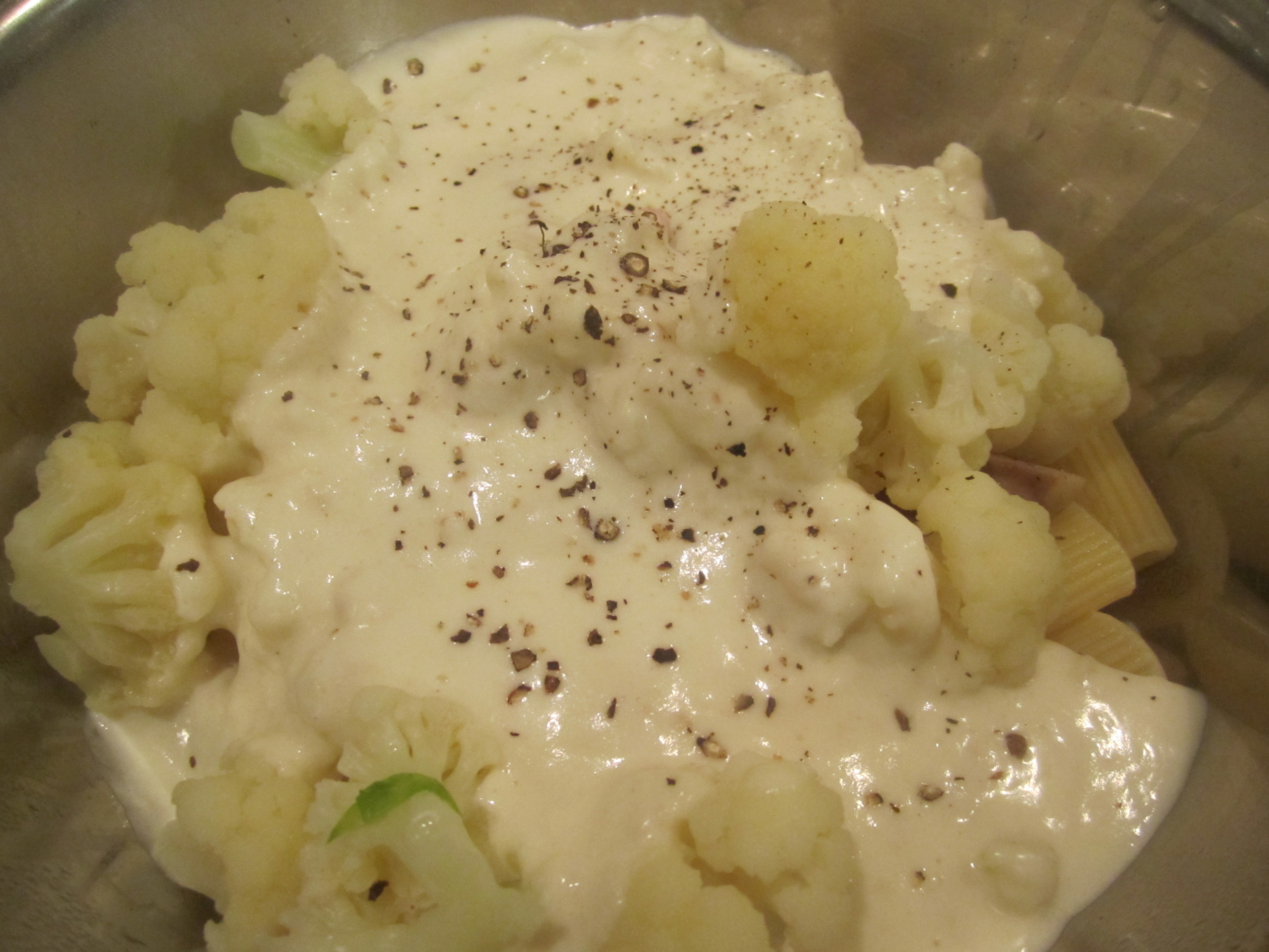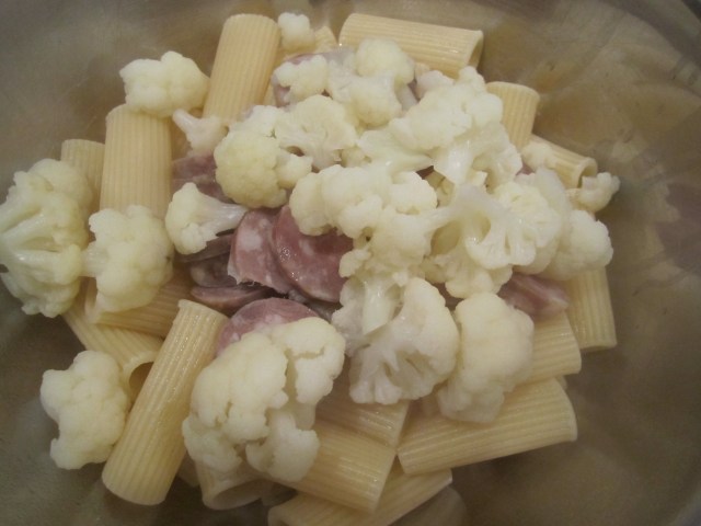 When pasta is ready, drain and combine with cauliflower and sausage in a mixing bowl.