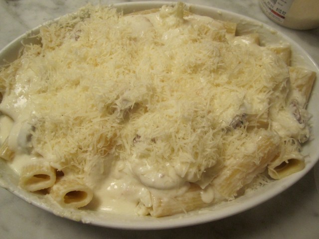Turn the mixture into a greased baking dish and top with the remaining bechamel, salt nd pepper to taste, along with all of the manchego.