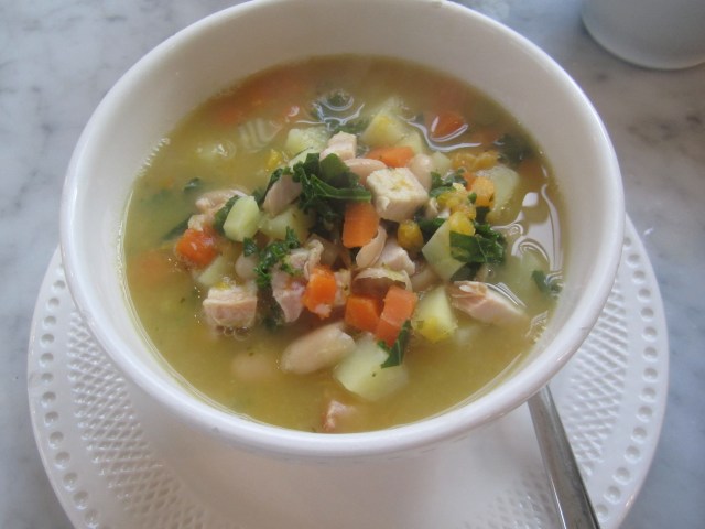 My turkey and white bean soup began by simply peeling and dicing a potato and carrot, and placing them in a quart of cold stock. I brought them to a boil and allowed them to simmer for 15 minutes. I then diced a cup of turkey meat and added it to the simmering soup, along with a can of drained white beans and a cup of cooked kale, sliced into small ribbons (you could substitute raw baby spinach). A drizzle of olive oil and some grated parmigiano were all that were necessary to turn this lunch into something extraordinary.
