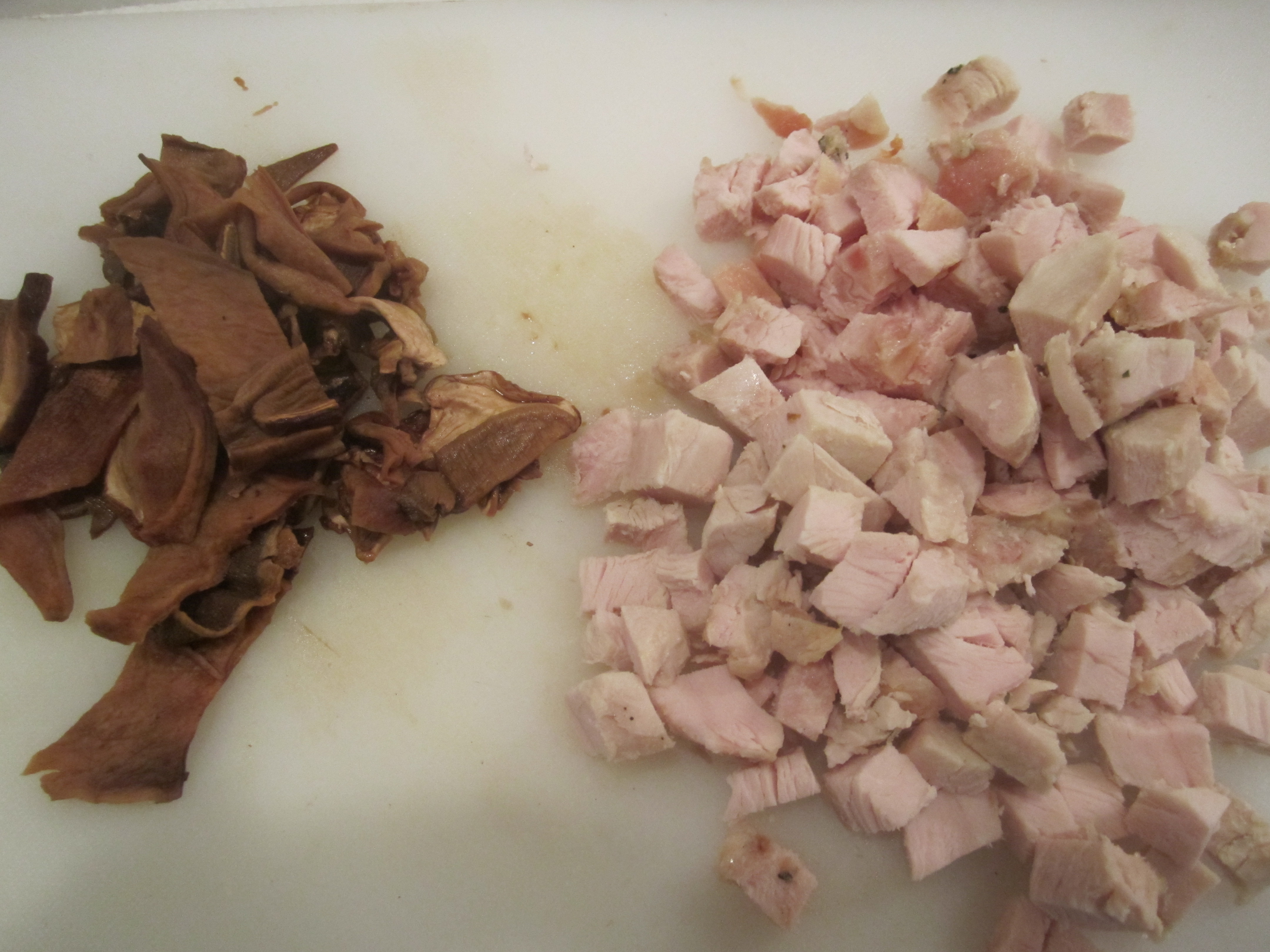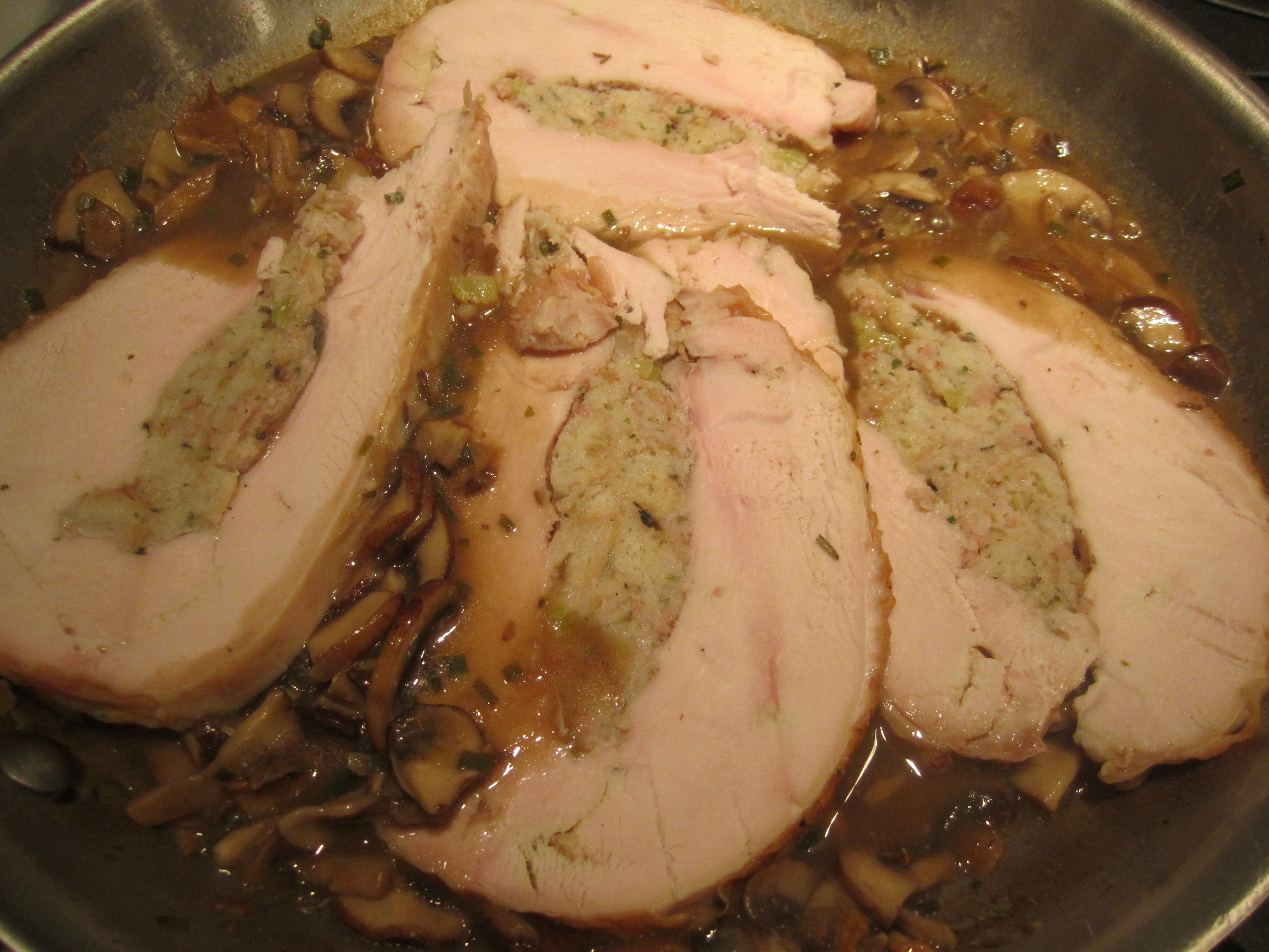 For dinner the following evening, I decided to make a moist medium in which to simmer some slices of the cooked turkey breast. My Salsa di Funghi was the perfect sauce for this. Once the sauce was at the right consistency, I added in some slices of stuffed turkey breast and simmered, covered for about 10 minutes.