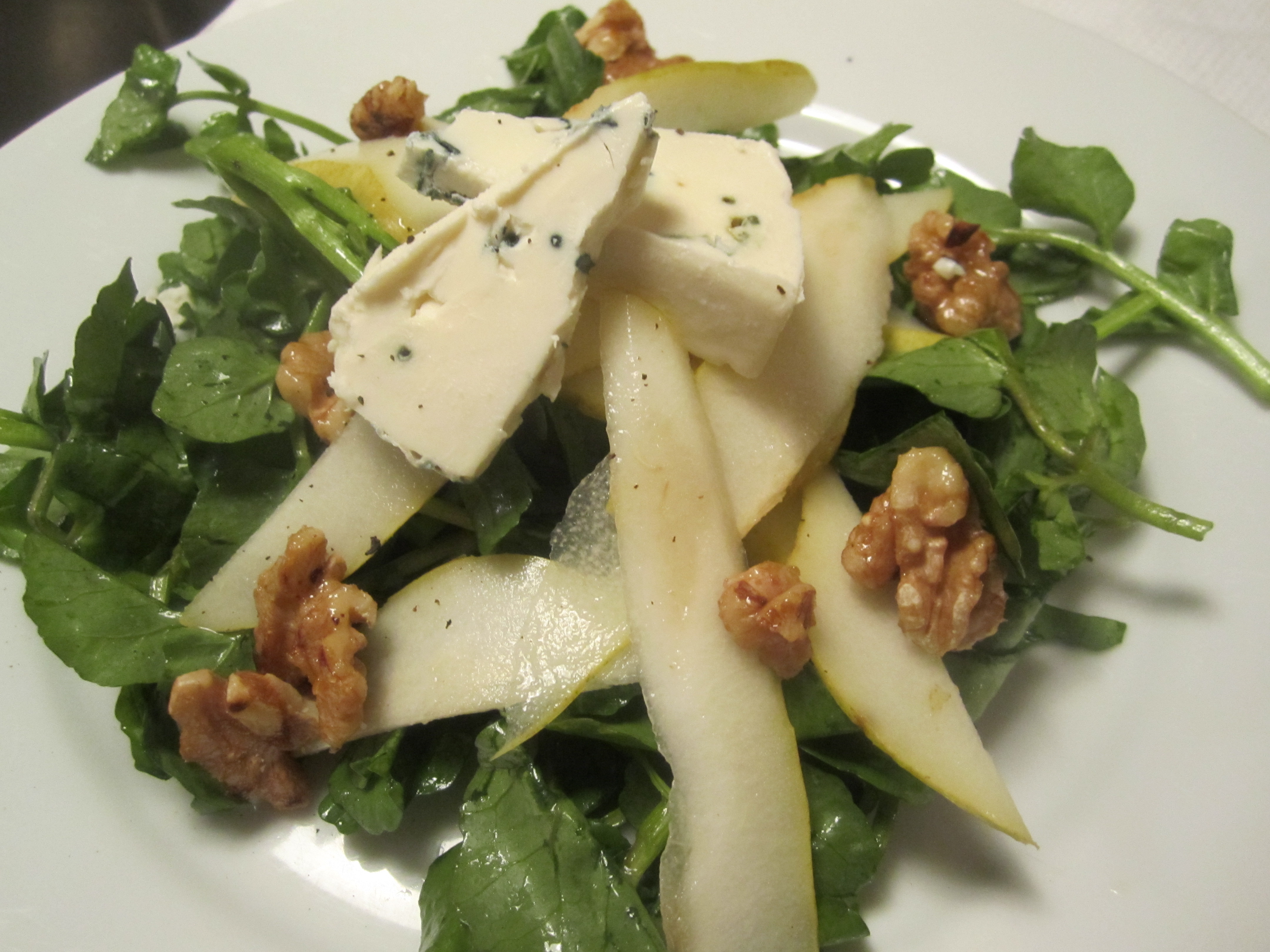 We began this meal with a salad of pears, watercress, blue cheese and toasted walnuts.