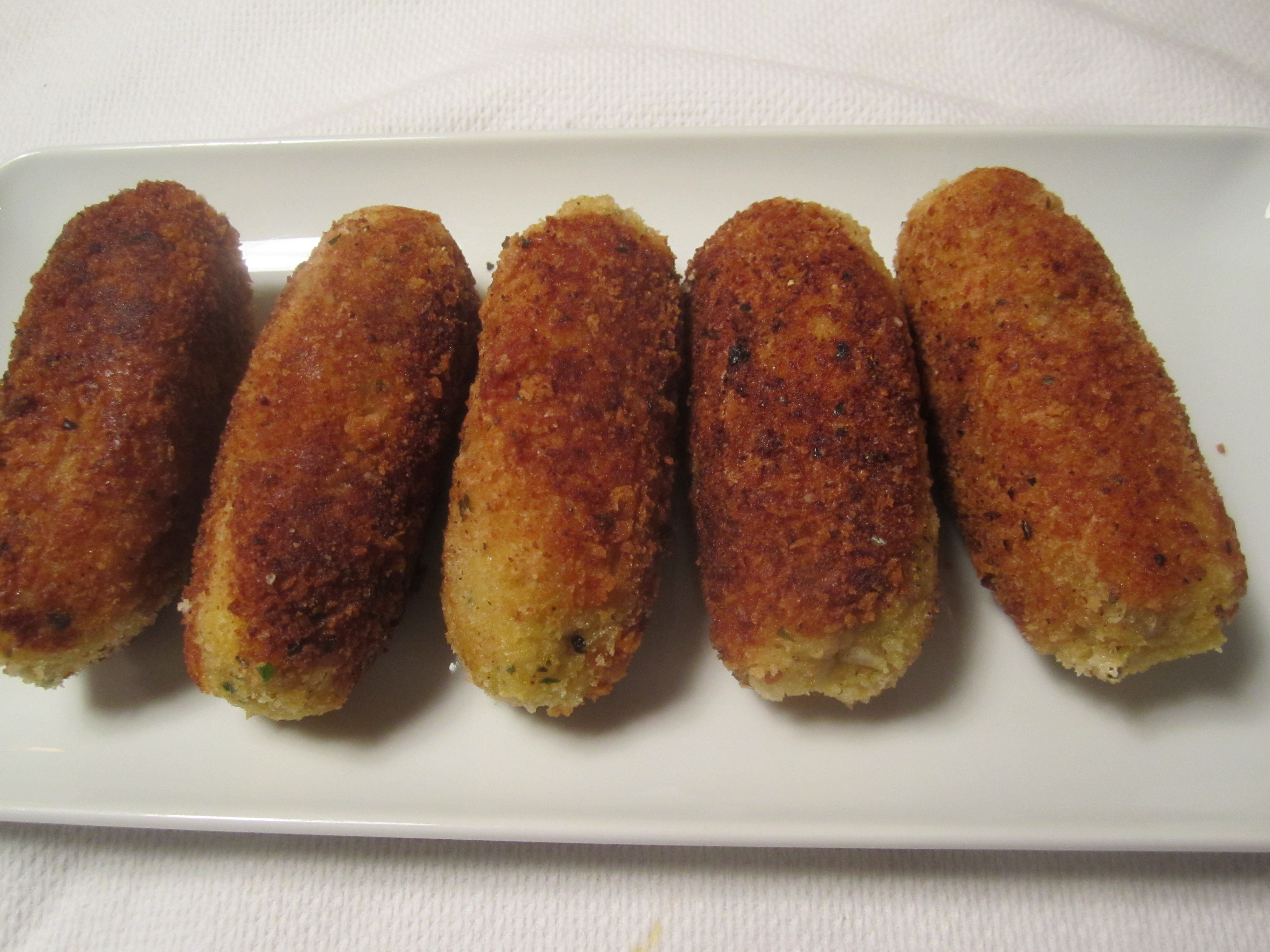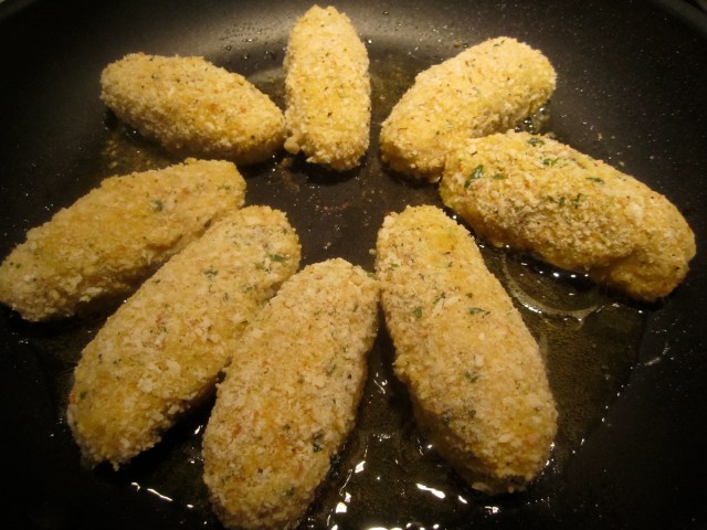 The leftovers from my risotto led me to my all-time favorite product of recycling–Beppi’s Crochette di Riso–rice croquettes. I’ve diced up the remaining turkey meat and put it in these croquettes (made from the porcini risotto).