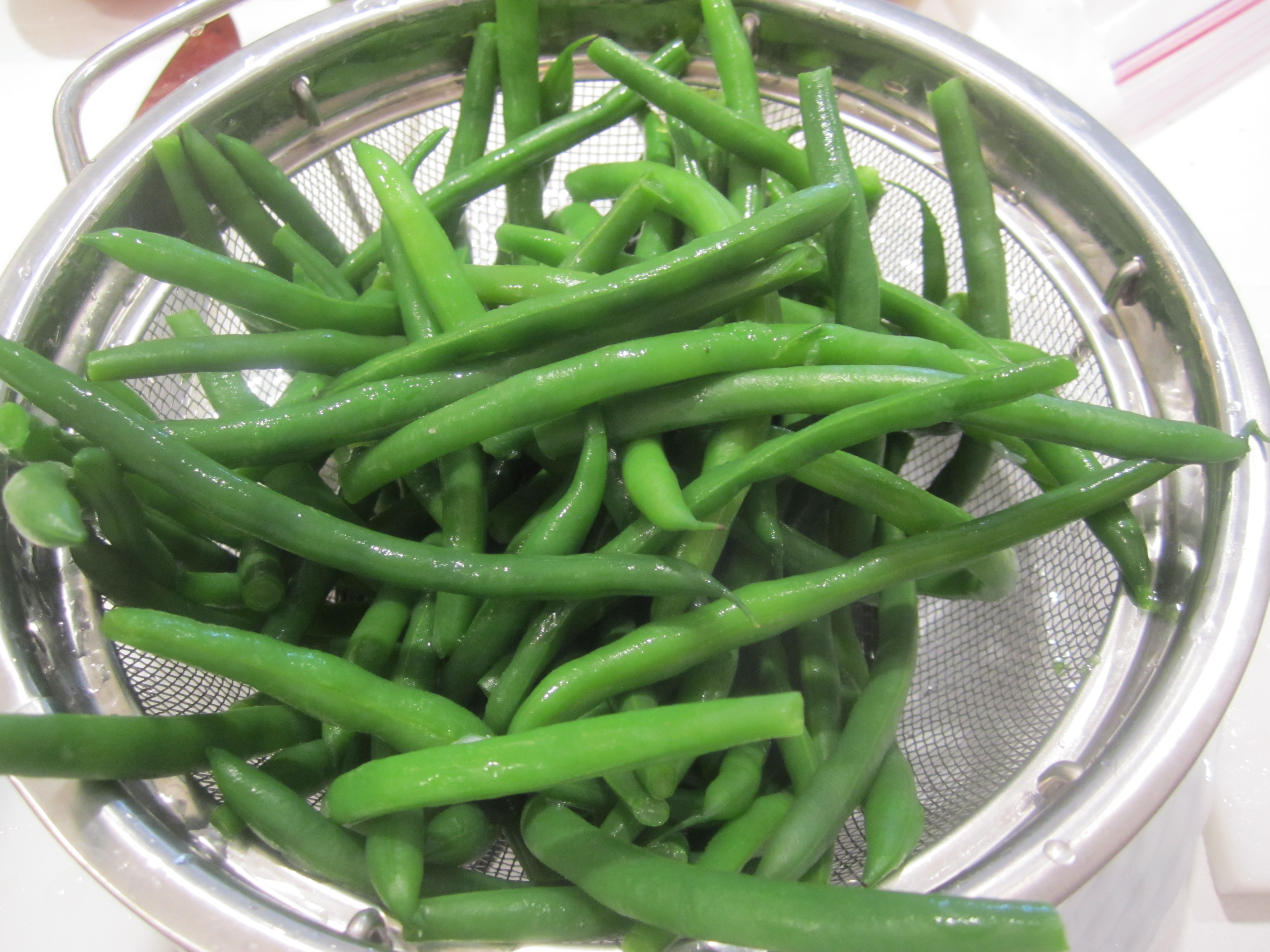 Drop green beens into boiling salted water for approximately 5 minutes, or until crisp-tender. Run under cold water to stop cooking process, then drain. Toss with a teaspoon of olive oil and salt to taste. Set aside until ready to assemble salad.