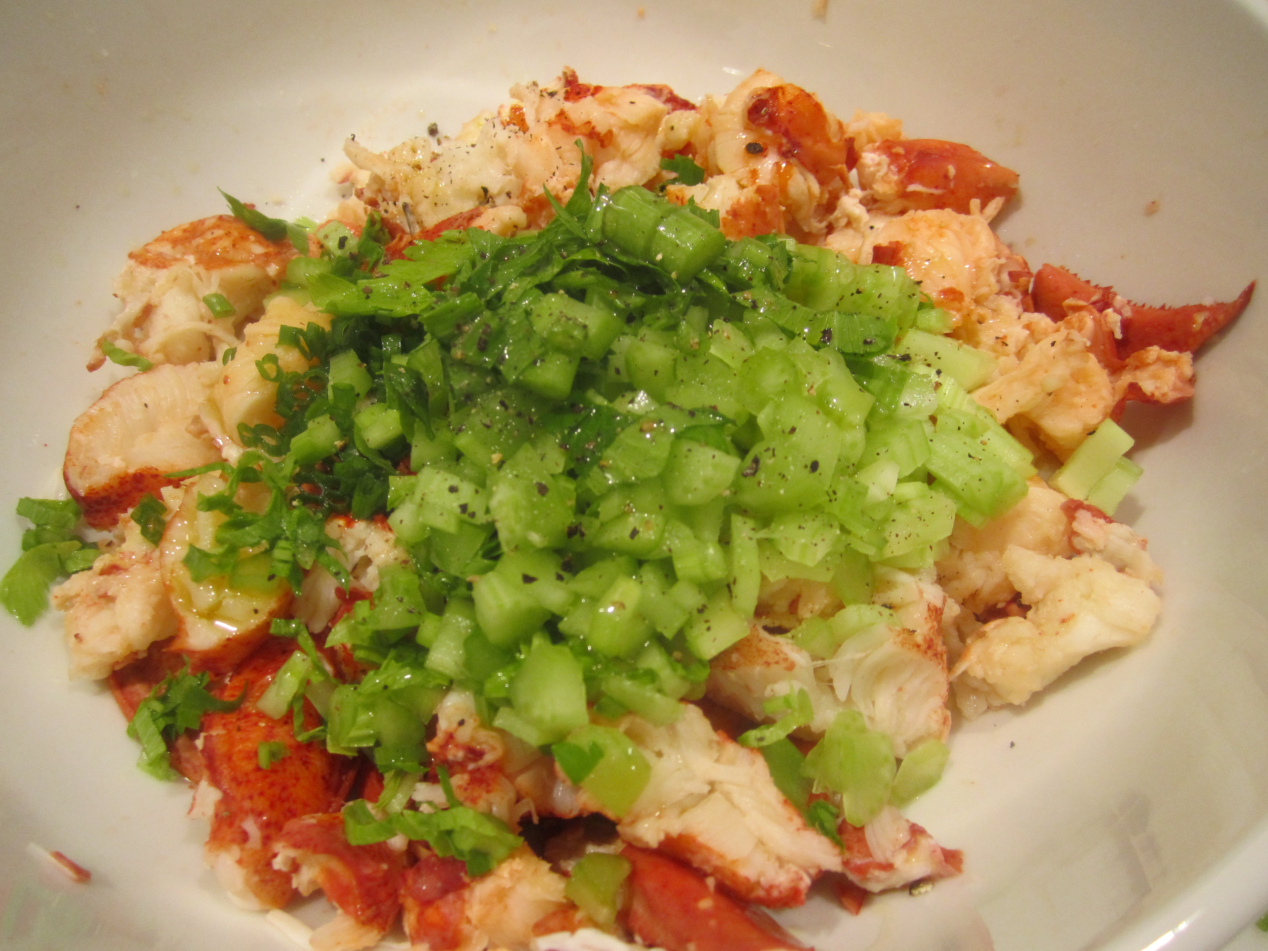 In a mixing bowl, combine lobster, celery, chives, 1/4 cup oil, juice of 1 lemon, salt and pepper to taste.