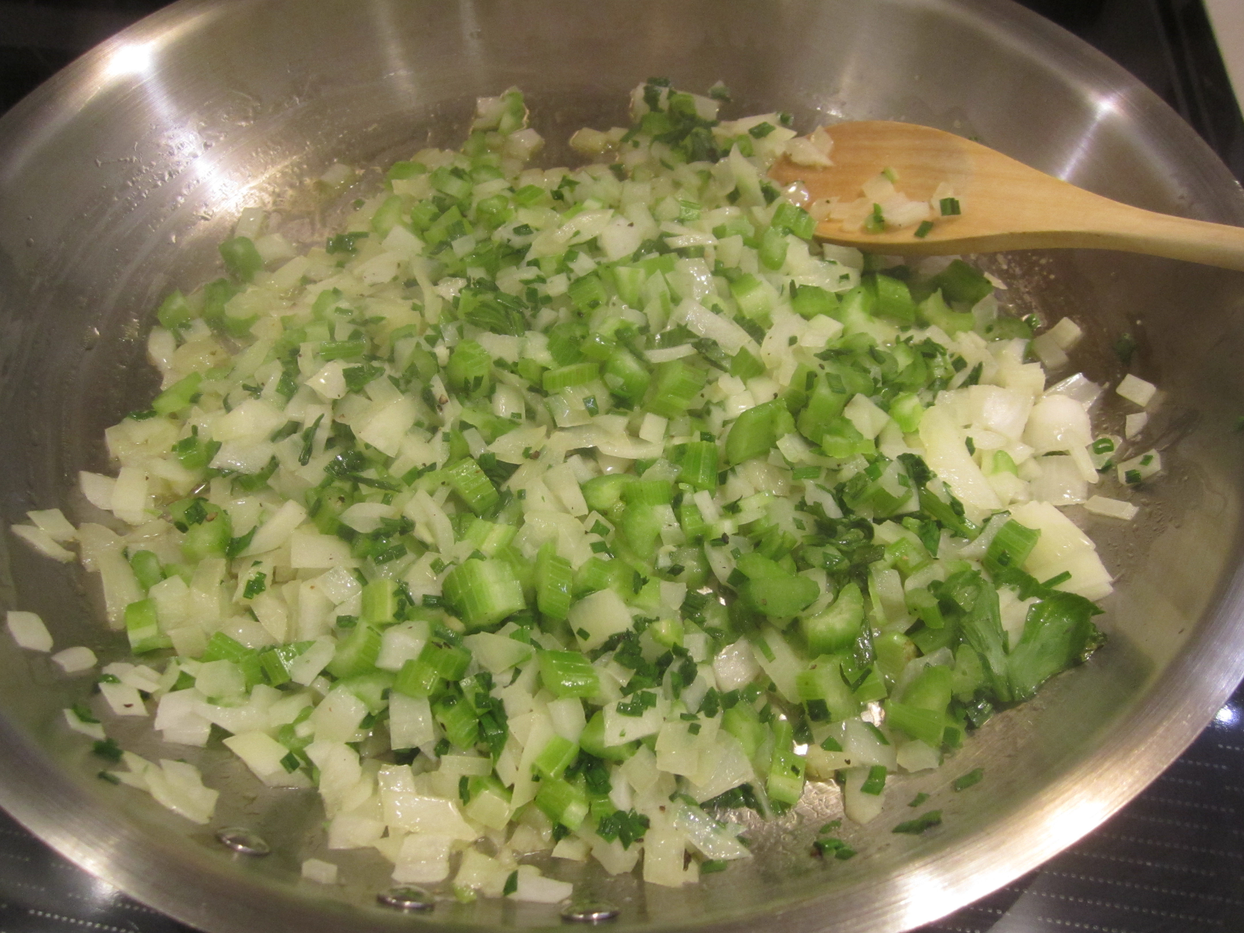 Place butter in a skillet, along with onions and celery. Bring to a sizzle and saute on low heat for about 10 minutes, or until softened, but not caramelized. Add chives and saute another minute.