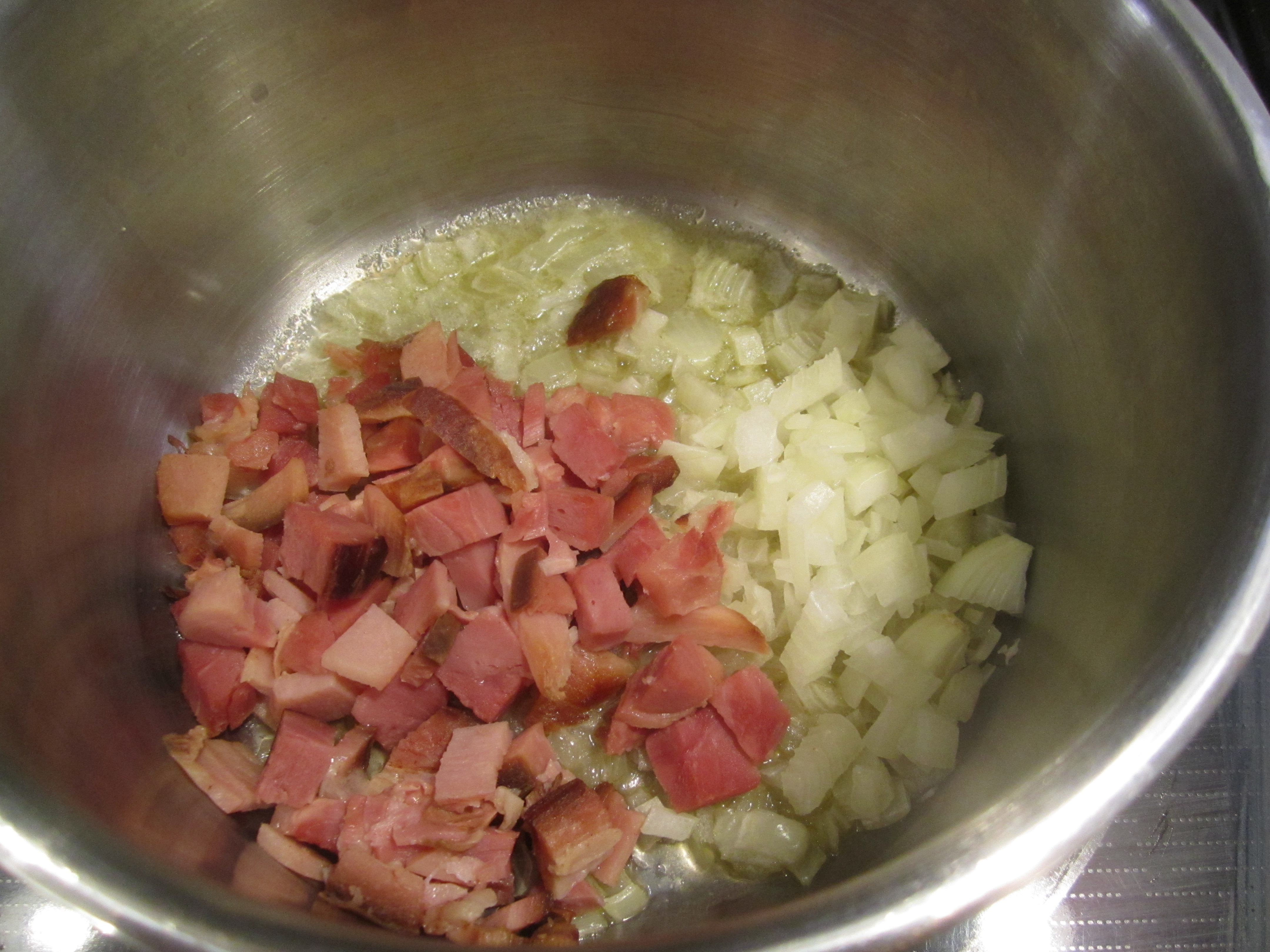 In another pot large enough to hold the soup, on low heat, saute the shallots and ham in butter for approximately 5 minutes.
