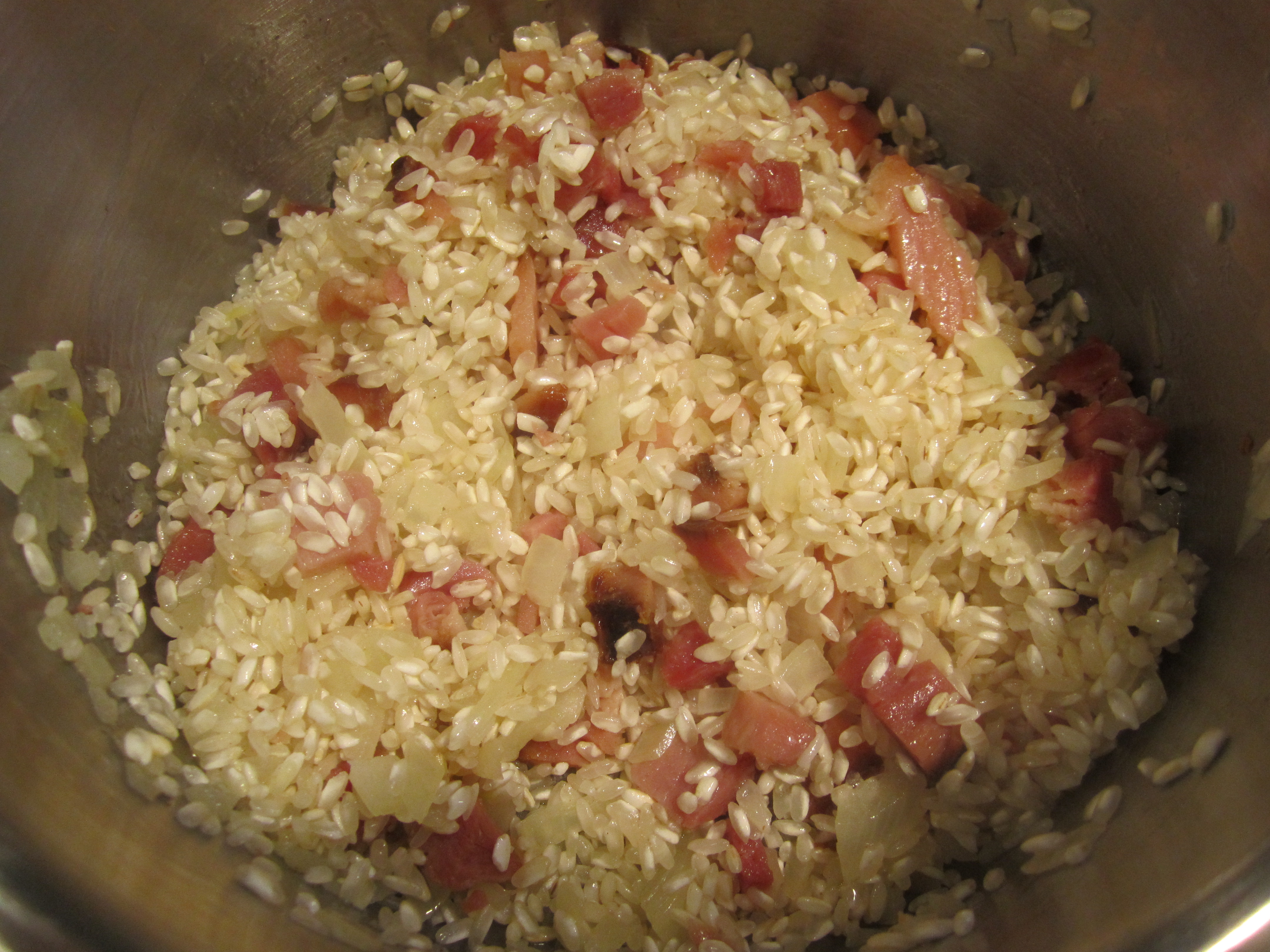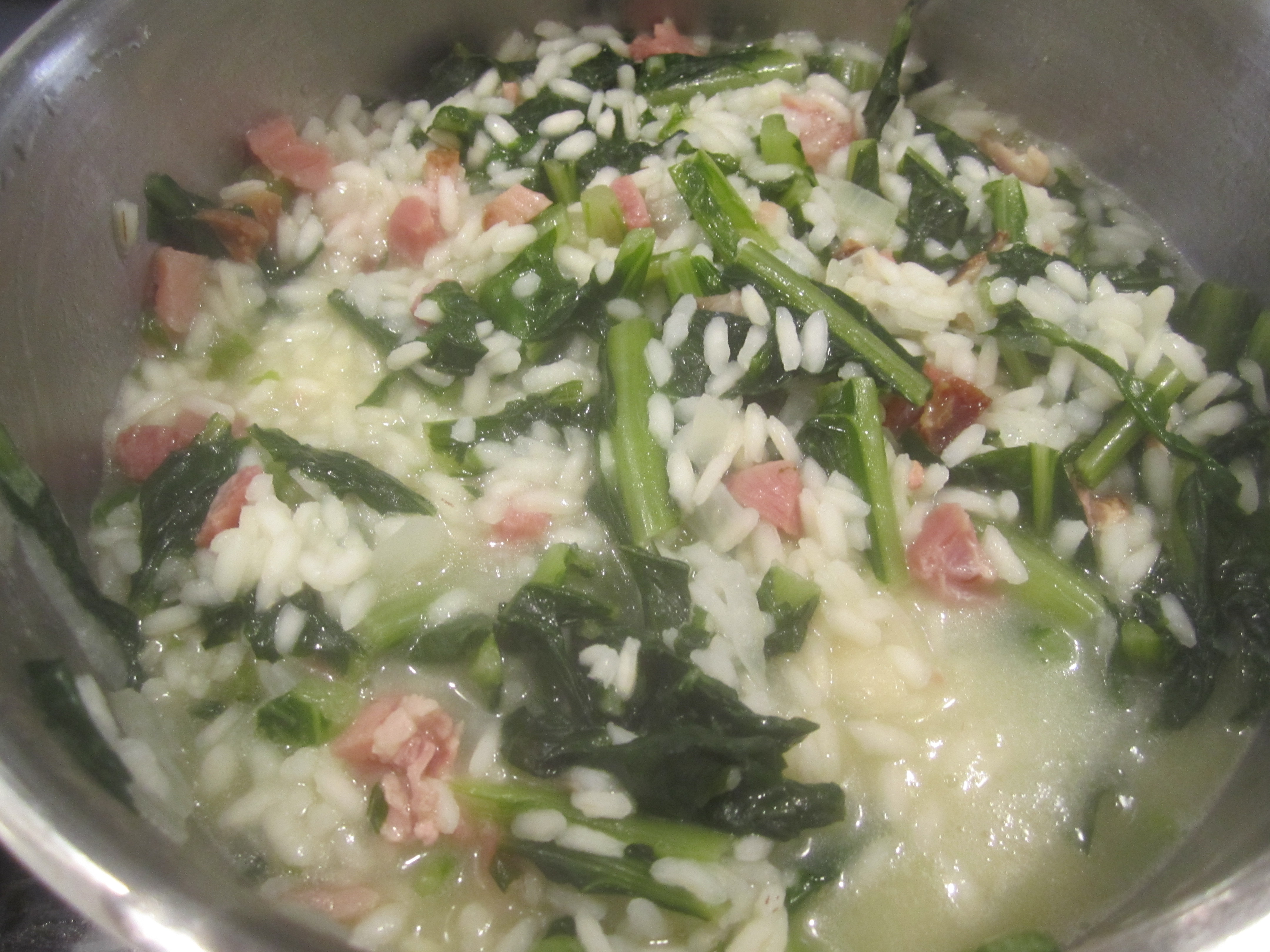 The traditional Roman way of serving dandelion (and so many other green vegetables) is to boil, then saute with garlic and chili pepppers (see my Ciccoria ala Romana). This week, however, I’m in the mood for something a little more comforting and soupier, which will feature the greens as a main course. Some diced ham from my local gourmet market, plus the usual risotto ingredients, made a perfectly rich and satisfying soup worthy of sharing with you.