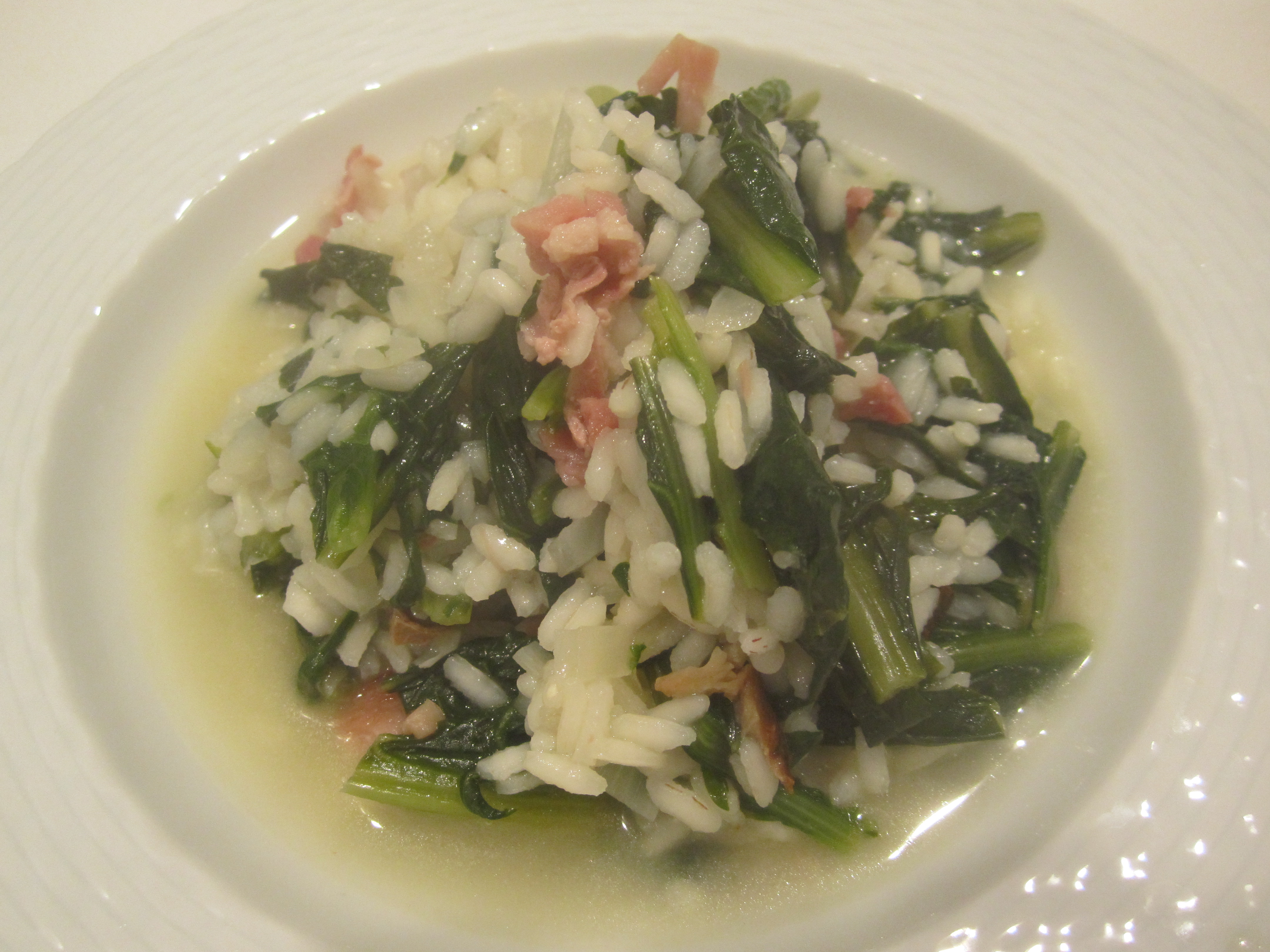 I made this soup using the standard risotto technique, but added much more broth than usual at the end. The broth takes in the combination of butter, white wine, smokey ham and bitter greens. It keeps well and can be reheated with additional broth (or just salted water, if you’ve run out of broth).