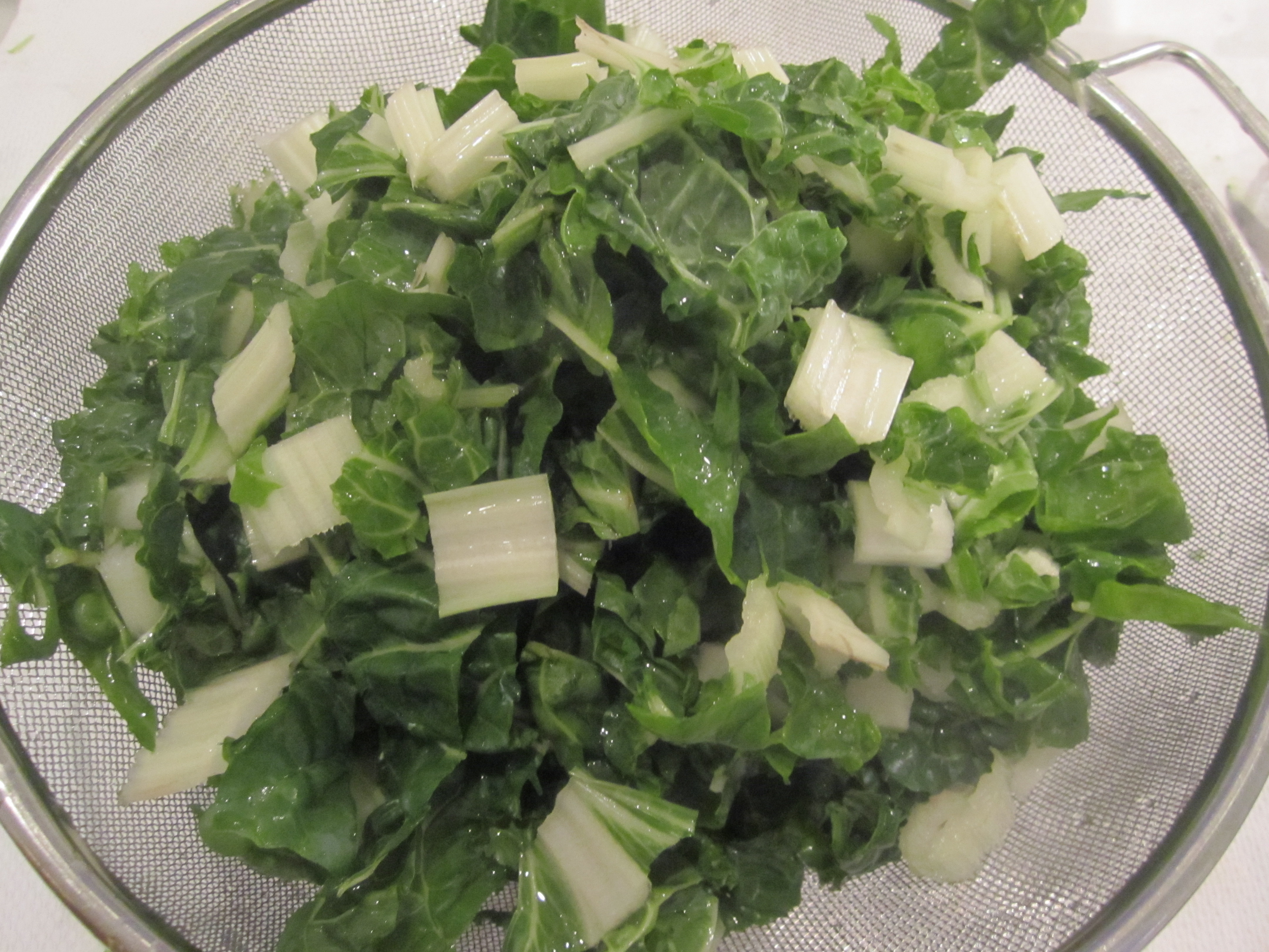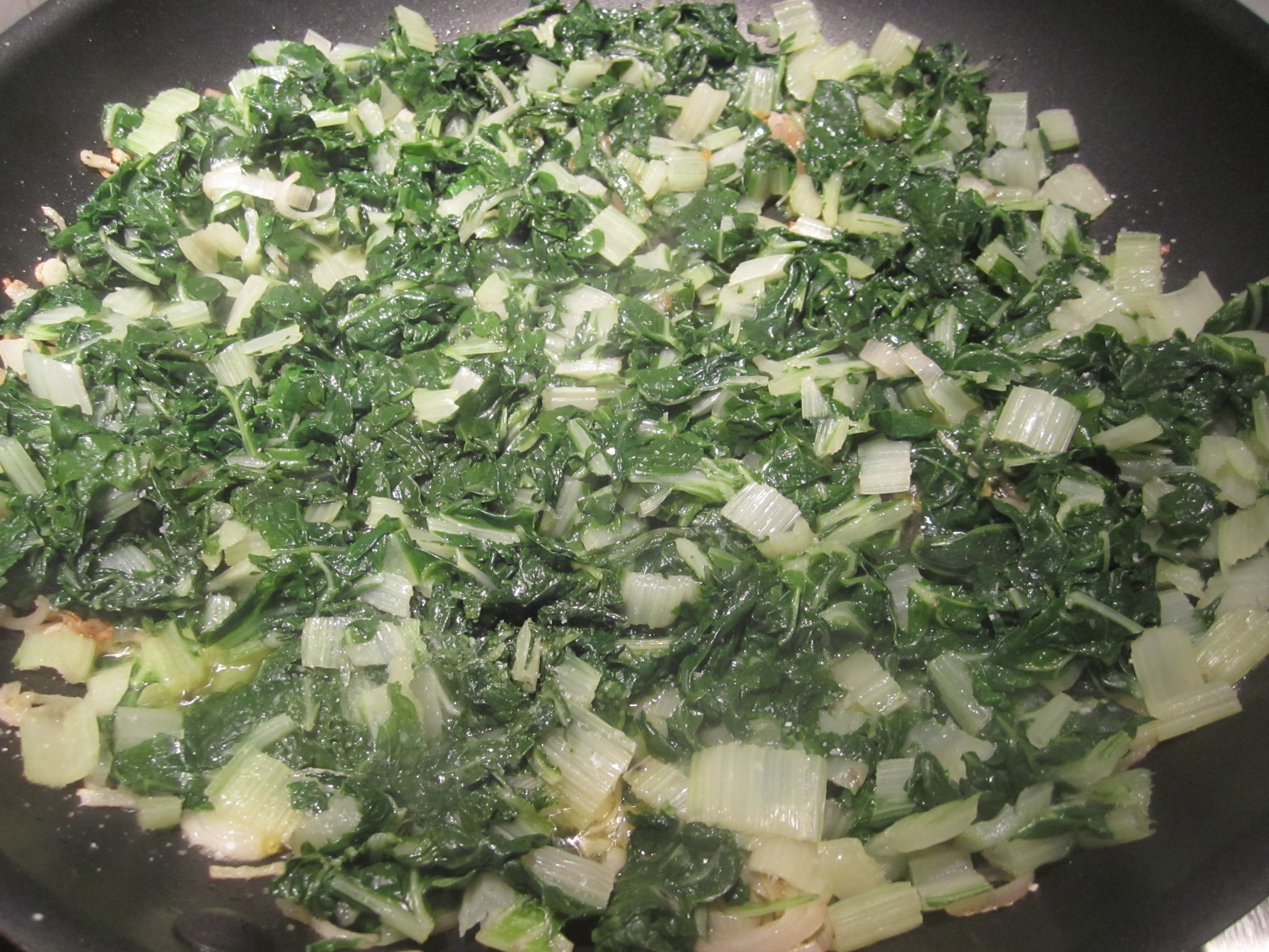 Add drained swiss chard and continue sauteing on medium heat for about 10 minutes, or until beginning to dry and crackle (indicating that the water has evaporated and the greens have begun to saute a bit).