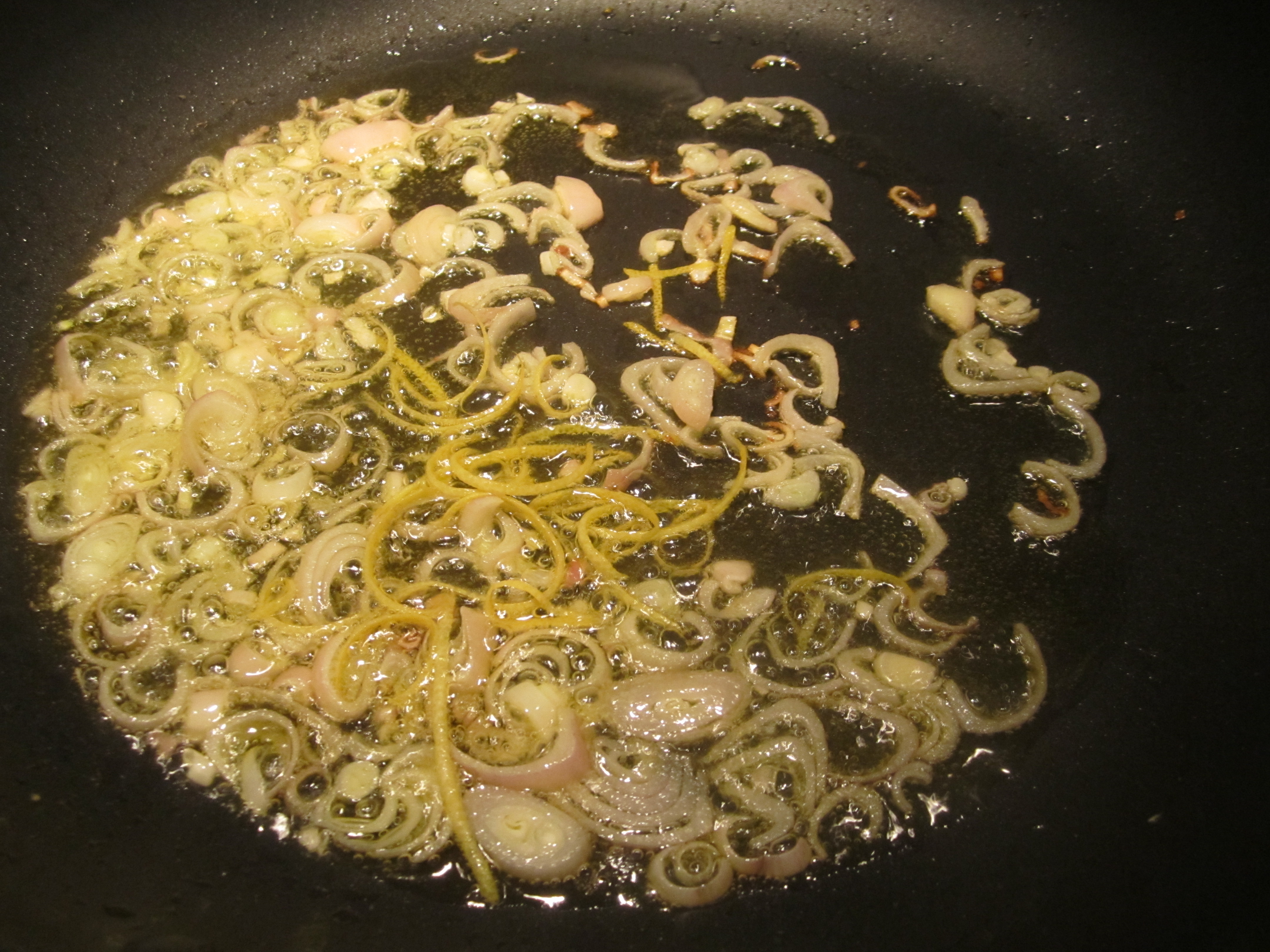 In a large skillet, add about a quarter cup of olive oil (per 2 bunches of chard), several shallots, sliced thinly, and the zest of a lemon.