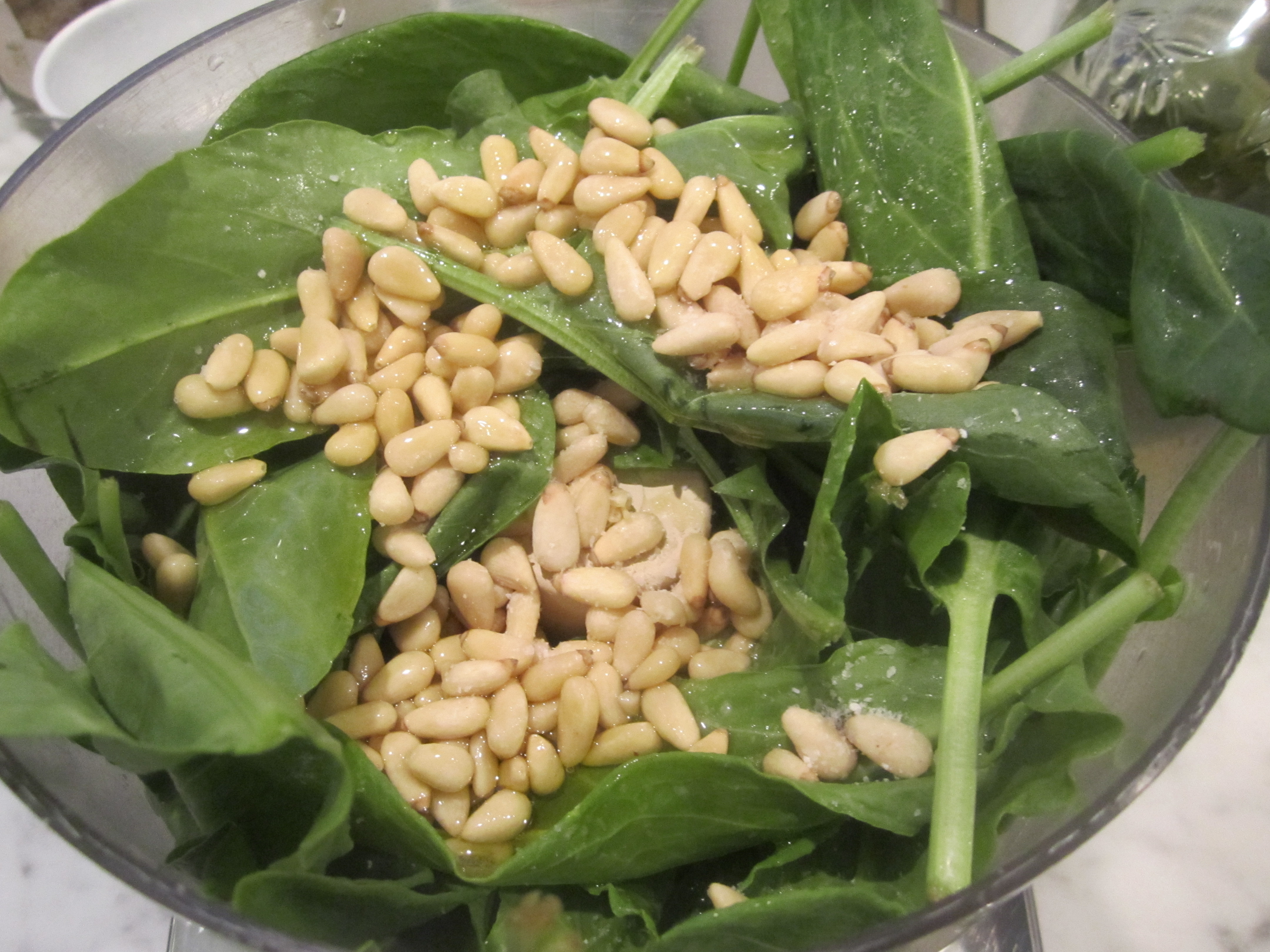 Simply place about 2 cups tightly packed sorrel leaves in the food processor, followed by a half cup of pine nuts, a quarter cup of olive oil and a half teaspoon of salt.